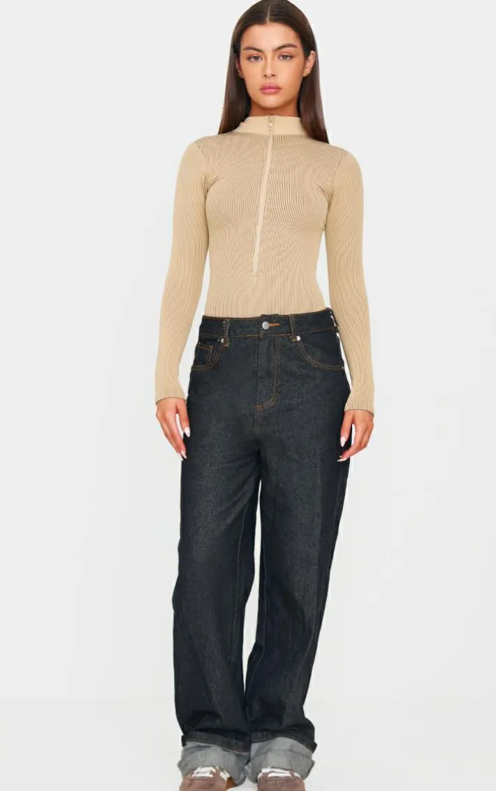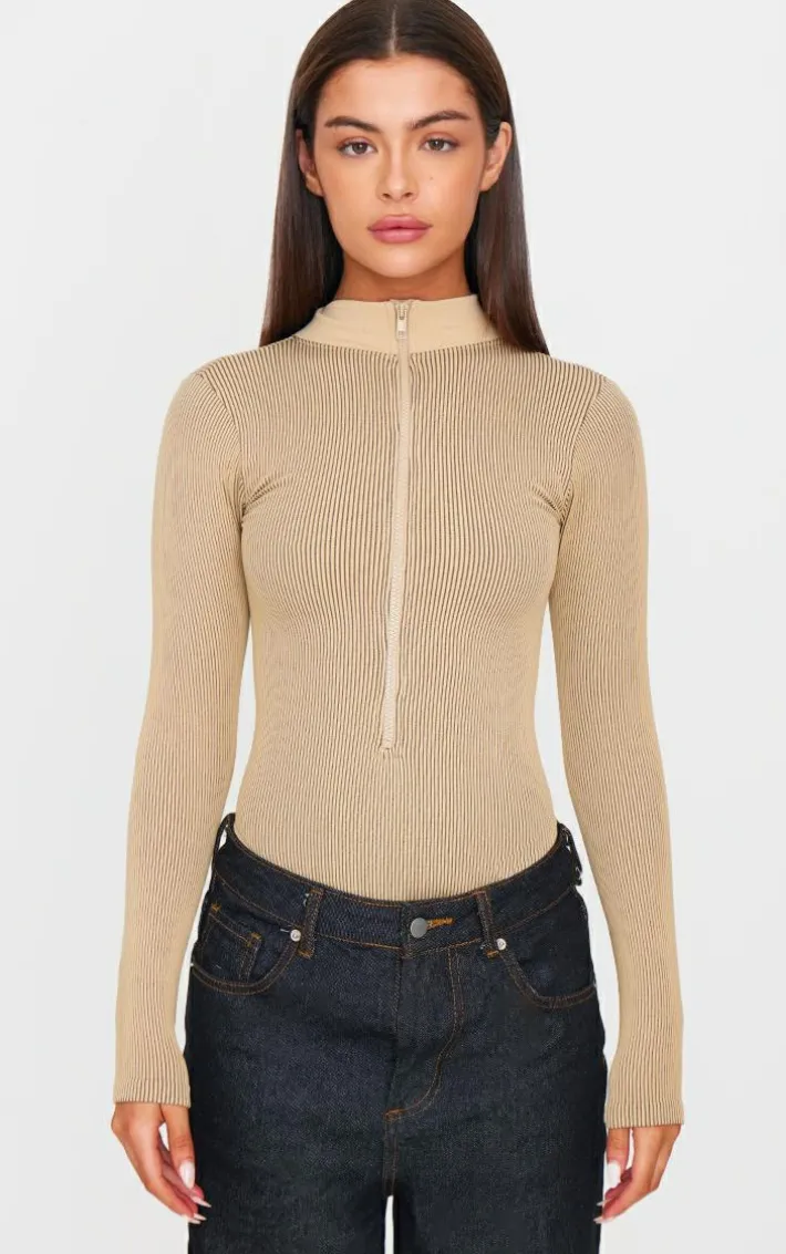 This stone contrast snatched rib zip up long sleeve bodysuit is perfect for those off-duty days and beyond. With its stone snatched ribbed material and zip-up design with long sleeves, we are in love. Perfect for the upcoming A/W season, this bodysuit will be the must-have piece that you will be reaching for time after time. Wear with black hue jeans for a look that will get you noticed.