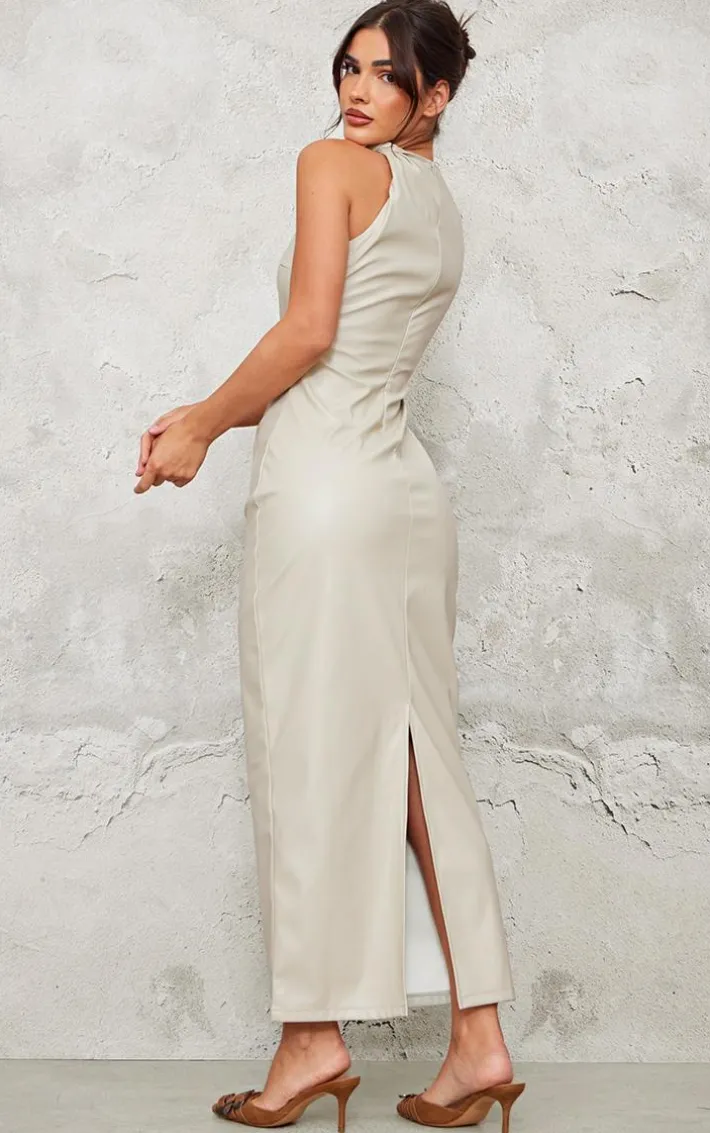 Ready to add some luxe vibes to your new season wardrobe? This stone faux leather high neck twist shoulder maxi dress is calling your name. Brought to you in a must-have stone shade, with a faux leather material, high neck design and twist shoulder detail, wear to your next weekend event for a look we’re crushing on. Style with a leather trench coat and neutral heels for a complete look.