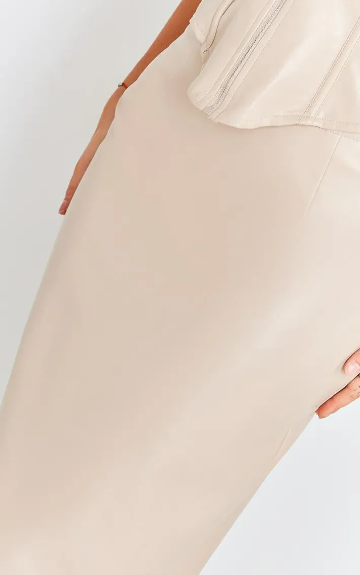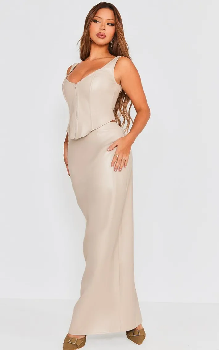 We are all about neutral hues this season and this stone faux leather high waist split hem maxi skirt is sure to keep you weekend look on point. Brought to you in a stone hue faux leather material with a flattering high waist design, split hem detail and a maxi length, how can you say no? Style this maxi skirt with the matching top and your highest heels for a look that will steal the stares.
