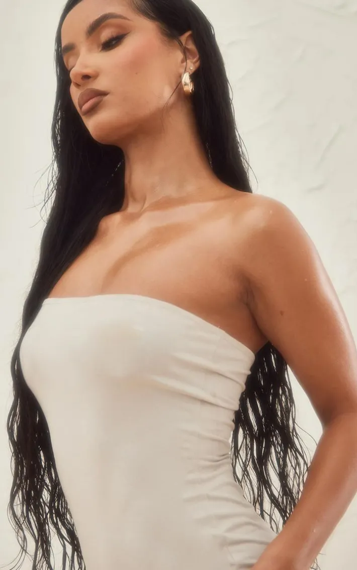 Have all eyes on you in this stone faux suede bandeau bodycon dress. With a stone hue and a faux suede material, this dress is sure to glam you up for your weekend plans. With a bandeau design and a bodycon fit, what’s not to love? Team with some gold hoops and a pair of clear heels to elevate your final look .