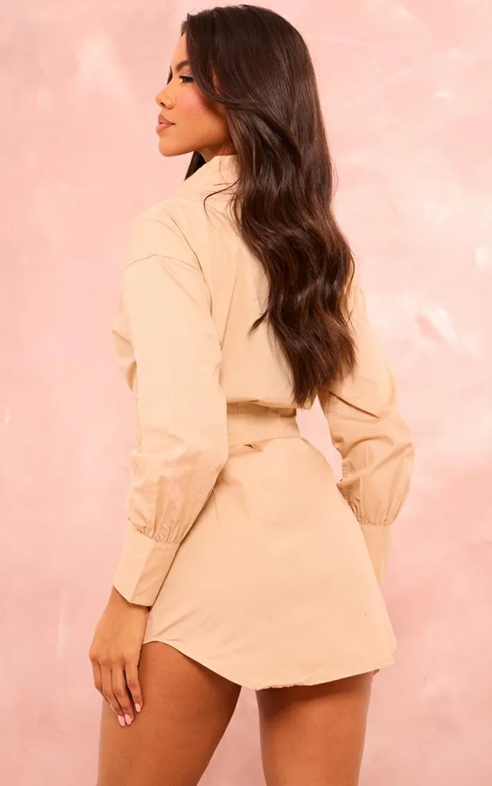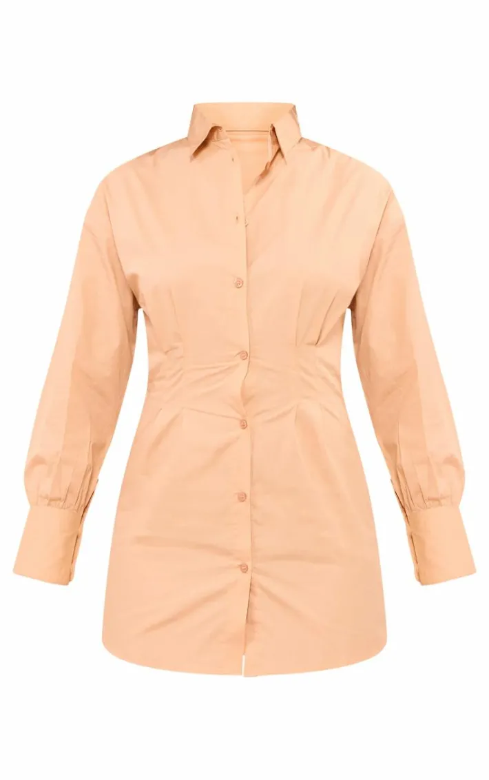 Add some neutral tones to your look this season with this shirt dress. Featuring a stone material with long sleeves, a fitted waist design and a flattering fit, we are in love. Style with chunky boots and a trench coat to finish the look.