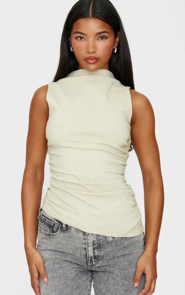 We can’t get enough of this stone high neck ruched asymmetrical long top for a new season look. Brought to you in a dreamy stone hue, with a high neck design, ruched detailing and asymmetric feature, you’ll be reaching for this daily. Style with a pair of grey wide leg jeans, cream heels and a shoulder bag to complete the look.