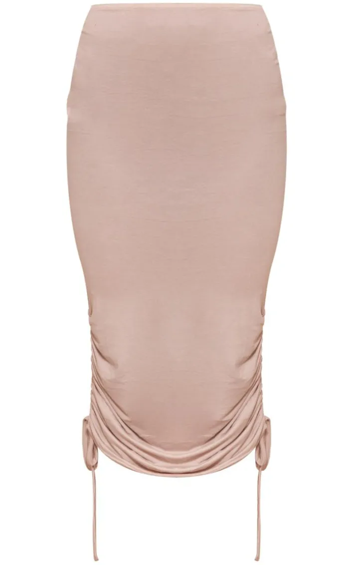 Calling all our neutral-loving s to check out this stone jersey ruched side midaxi skirt. Its stone jersey material is the perfect addition to your wardrobe and its ruched detailing gives a super flattering fit. With endless styling potential, you are sure to be reaching for this midaxi skirt again and again. Simply pair it with a basic crop top, chunky sandals and gold accessories for a look that won’t go unnoticed.