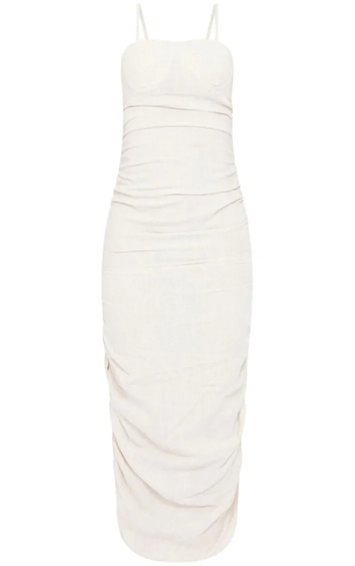 Get ready to show off your shape with this figure-worshipping stone linen look underwired ruched strappy midaxi dress. This dreamy dress is brought to you in a stone linen look material with an underwired design that will be showing off your shape in all the right places. With a ruched detail and a midaxi length, what’s not to love? Style with some clear heels and a statement bag, it’s a yes from us.