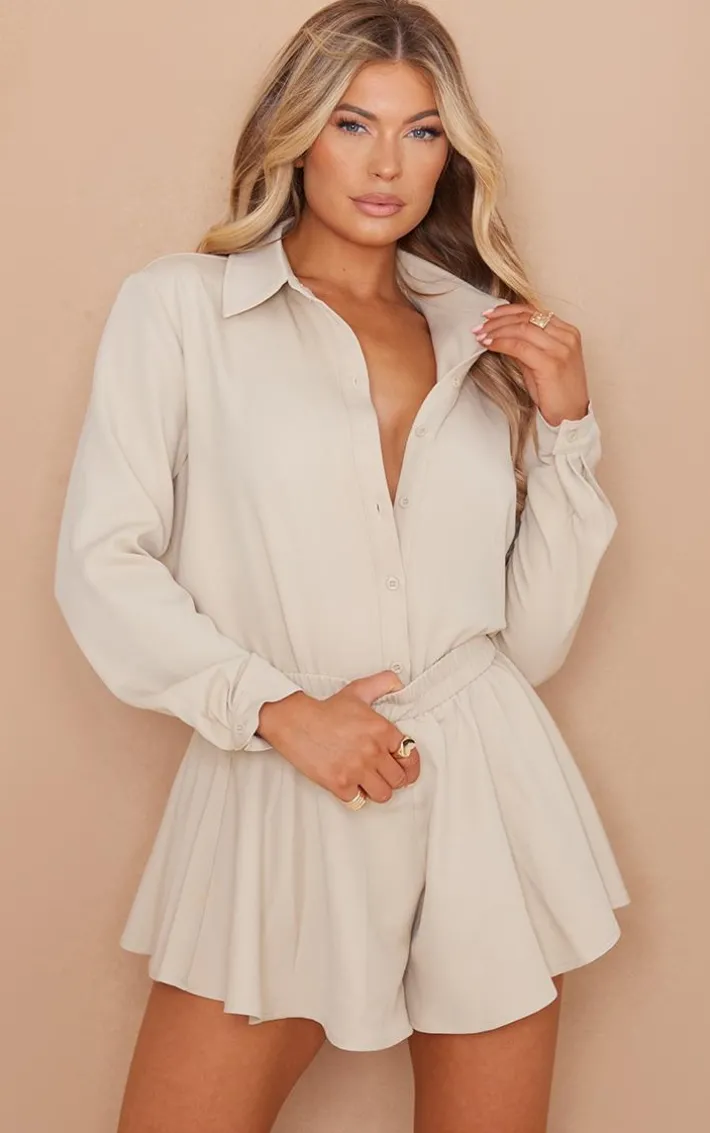 This versatile shirt is the perfect addition to your wardrobe. Featuring a stone material with stone material with a long sleeved design and oversized fit, what’s not to love? Dress to impress and style with the matching floaty shorts and gold accessories for a chic finish.
