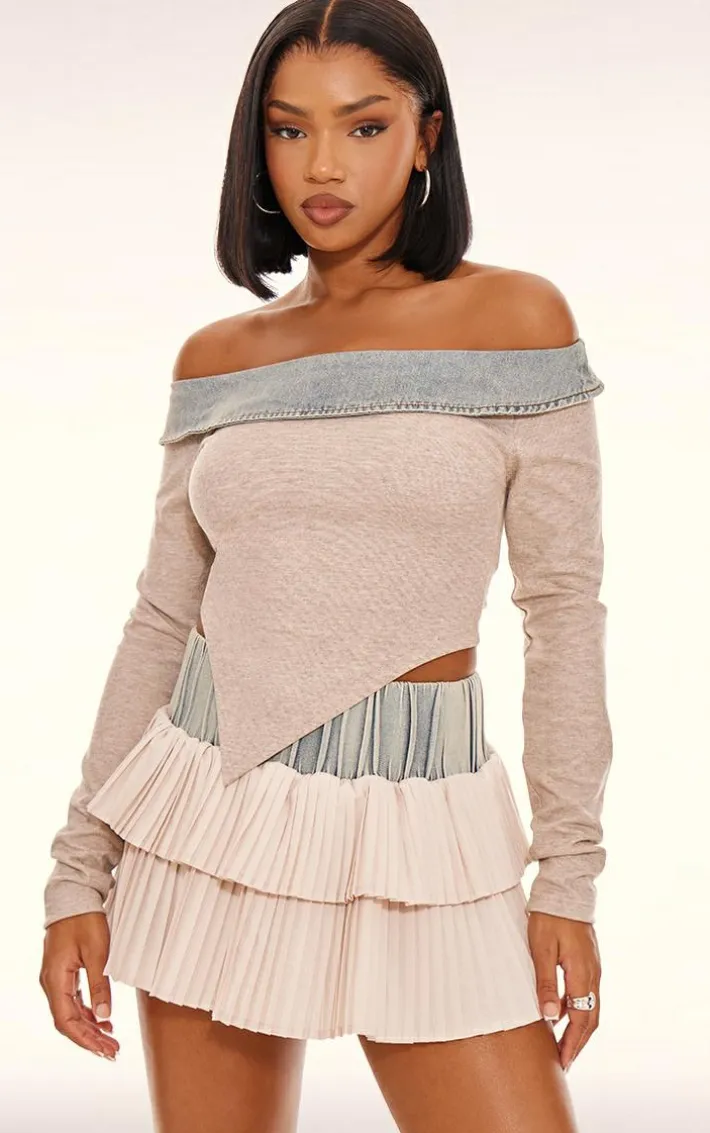 Get ready to earn some serious style points in this stone off the shoulder scoop neck denim collar top. Brought to you in a stone hue denim material with an off the shoulder design, a scoop neckline and a collar, how can you resist? Style this stone top with the matching skirt and boots for a look that is perfect for dressing up or down.