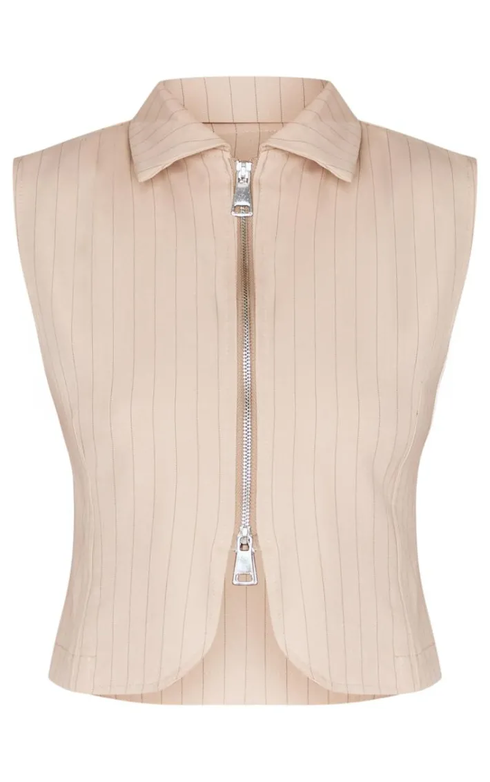 Keep it chic with this stone pinstripe double zip sleeveless shirt. Brought to you in a neutral stone hue, with a luxe pinstripe design and doble zip detail, this shirt is as versatile as your lifestyle. Team with a pair of jeans and minimal accessories to really make an impact. It’s a definite yes from us.