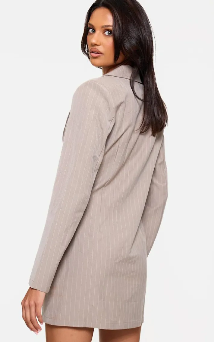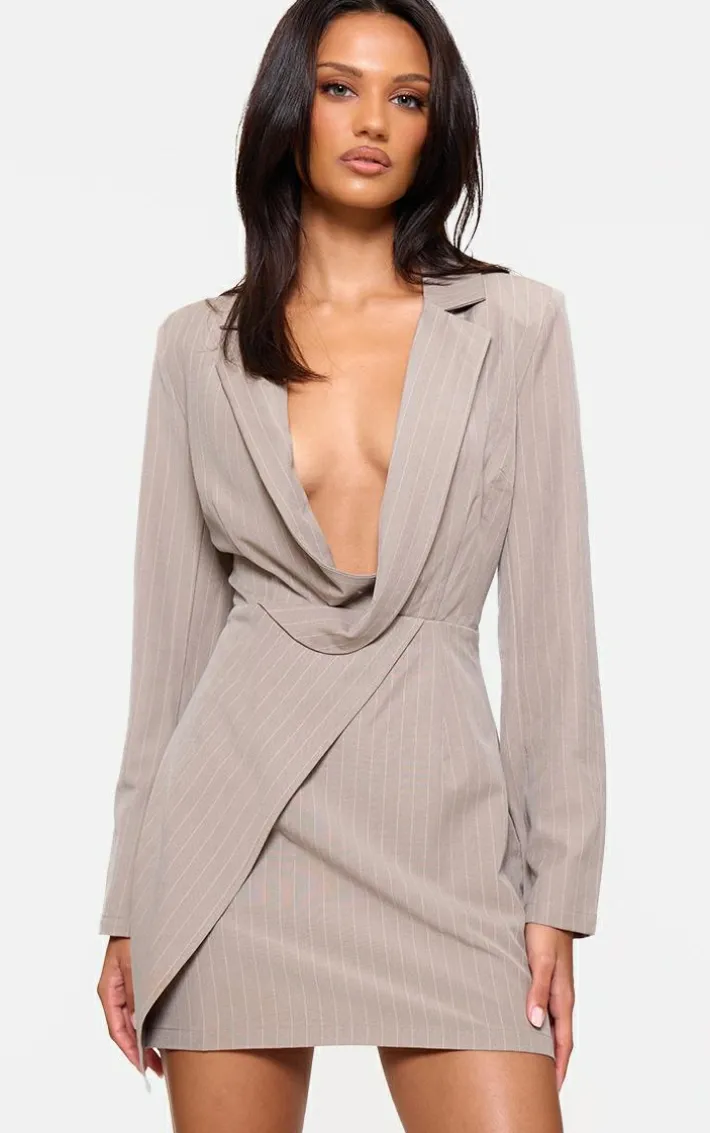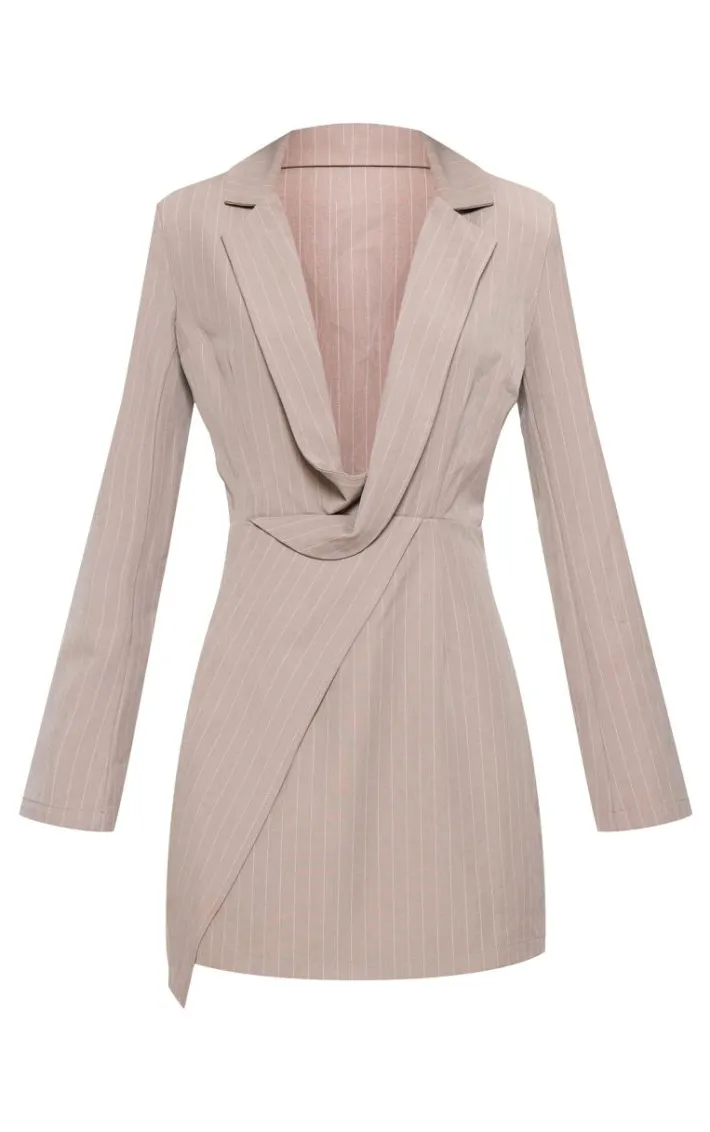 Enter the new season in style with this stone pinstripe plunge blazer dress. Brought to you in a stone hue pinstripe material with a plunging neckline, long sleeves and a flattering fit, we are obsessed. Style this blazer dress with court heels and your fave accessories to take your look that extra mile.