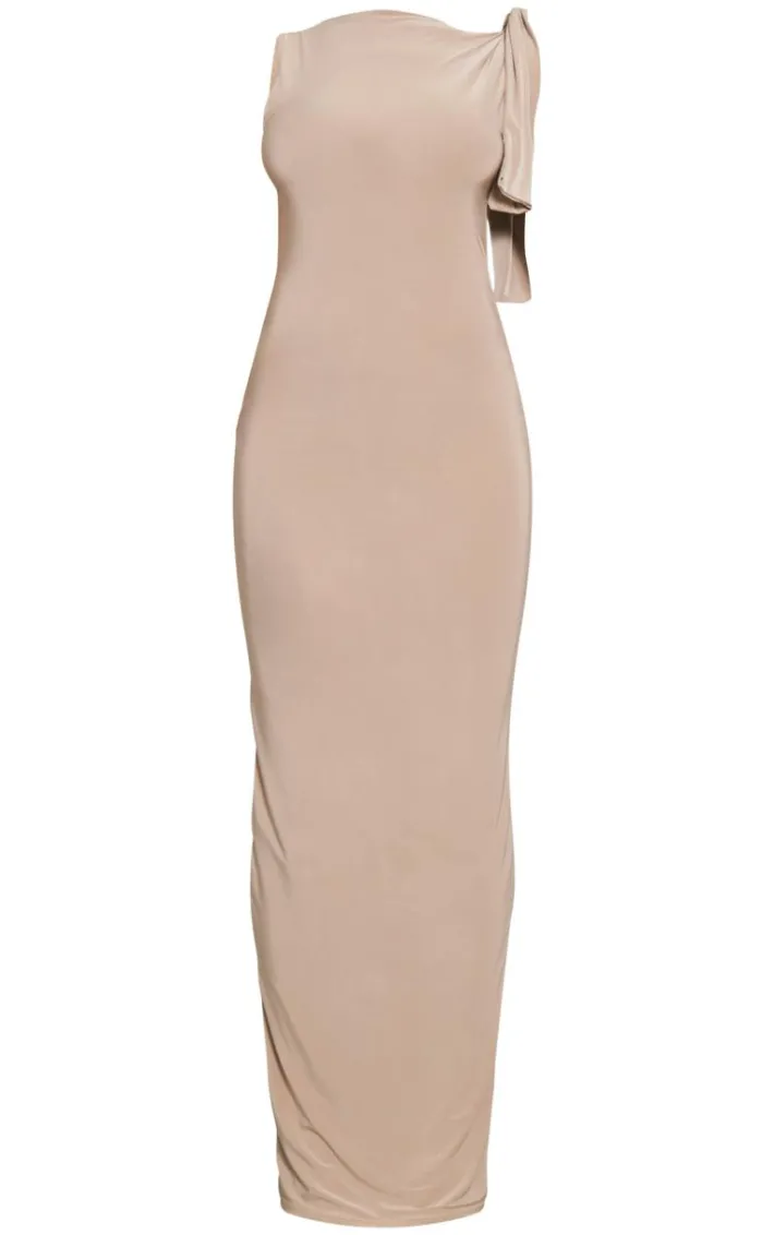 We’re all about neutral hues this season and this stone slinky knot drape midaxi dress is here to solve all your styling dilemmas. With a stone slinky material with a drape knot detail and a midaxi length, you won’t be able to resist this dress. Team this with high heels and your statement accessories for an effortlessly chic look everyone will be asking about.