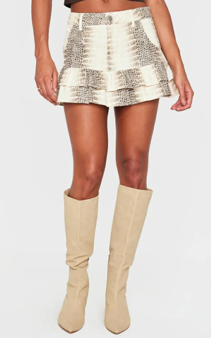 This stone snake print faux leather frill hem mini skirt is a must have weekend piece. Brought to you in a statement stone snake print design, with a flattering faux leather material and frill hem detail, what’s not to love? Simply pair with a brown faux leather top, suede knee length boots and simple accessories to let the skirt speak for itself.