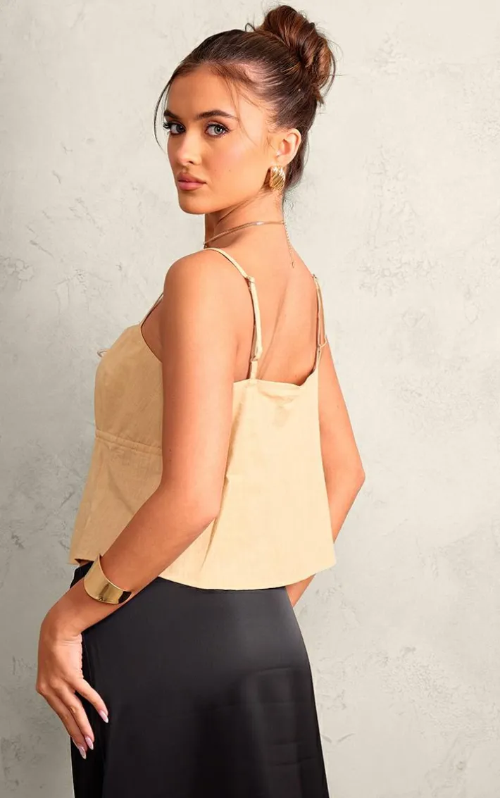 Make sure your new season look stays on point with this stone tie front spaghetti strap top. Brought to you in a stone hue material with a tie front design and spaghetti straps, what more could you want? Style this stone top with a maxi skirt and some statement accessories for a look that is sure to make heads turn wherever you go.