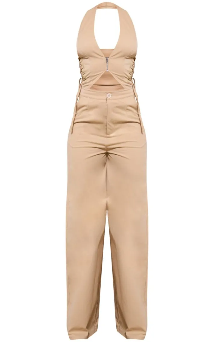 Switch out your dresses for this unreal stone woven halter zip detail lace up jumpsuit. Brought to you in a stone hue woven material with a halter neck design, lace up detailing and a half zip, how can you not be obsessed? Perfect for dressing up or down to suit your weekend plans, this flattering lace up jumpsuit is sure to be a staple in your new season wardrobe. Just add heels and gold accessories to instantly elevate the look.