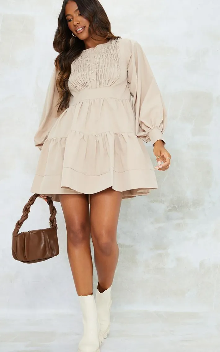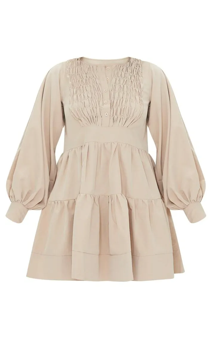 Add some chic, feminine feels to your weekend wardrobe with this dress. Featuring a stone woven material with ruffle detailing and a smock design. Wear this with rubber boots and a shoulder bag for a look that will get you noticed.
