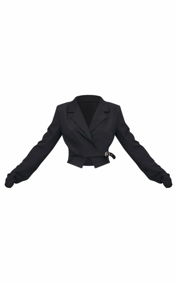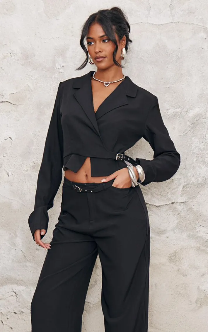 Enter the weekend in style with this tall black buckle detail cropped blazer. Brought to you in a black hue material with a cropped fit and buckle detailing for that extra added edge, what more could you want? Style this cropped blazer with the matching pants, heels and gold accessories for an effortlessly chic look that won’t be forgotten.