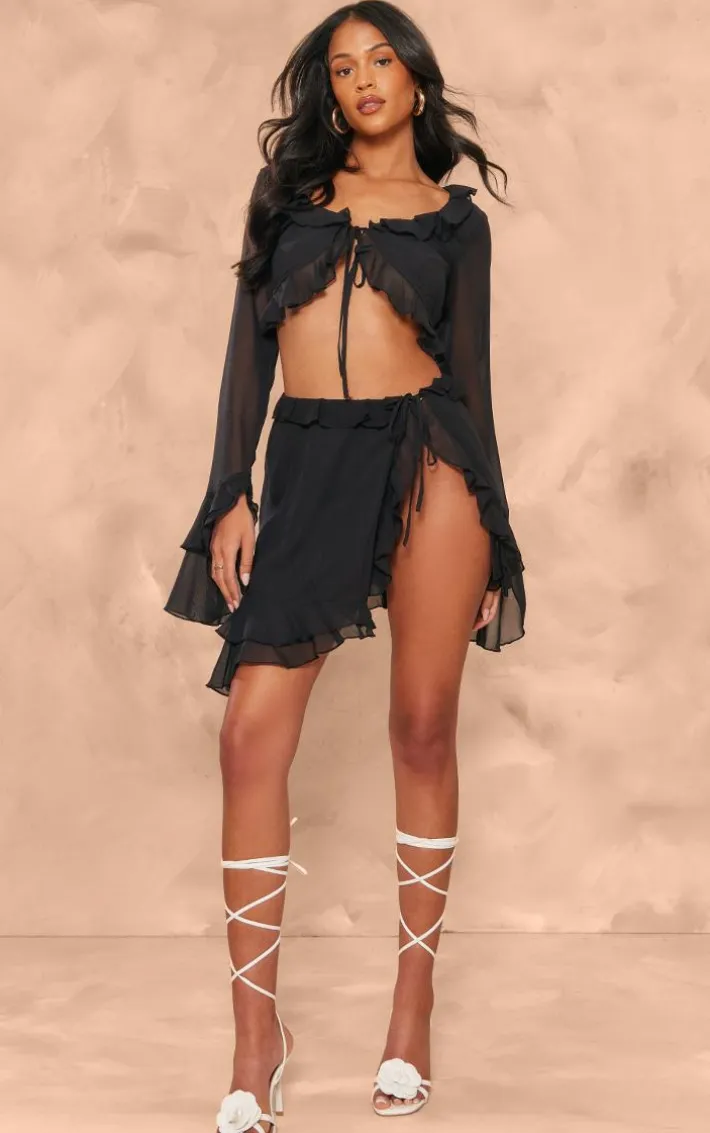 When the weekend calls for a little drama this tall black chiffon frill detail split mini skirt will have you at the center of attention. It is made using ablack chiffon material with a split side and a mini length, what more could you want ? Style this with the matching top, clear slip-on heels and statement accessories to elevate the look further.