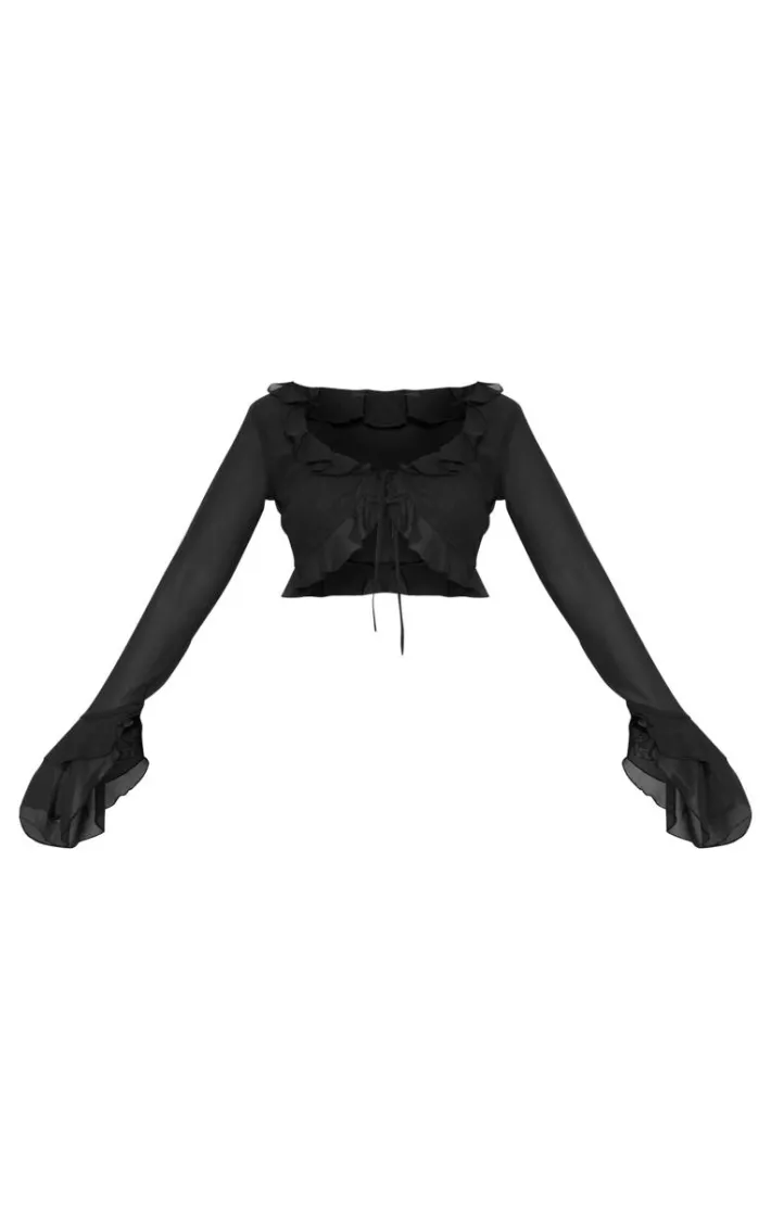 When the dress code calls for glam, we’ve got you covered with this tall black chiffon frill detail tie crop top. Brought to you in a black chiffon material with frill detail, a tie front and a cropped length, you really can’t go wrong. Style this with the matching mini skirt, gold accessories and slip-on heels for a look that is sure to turn heads.