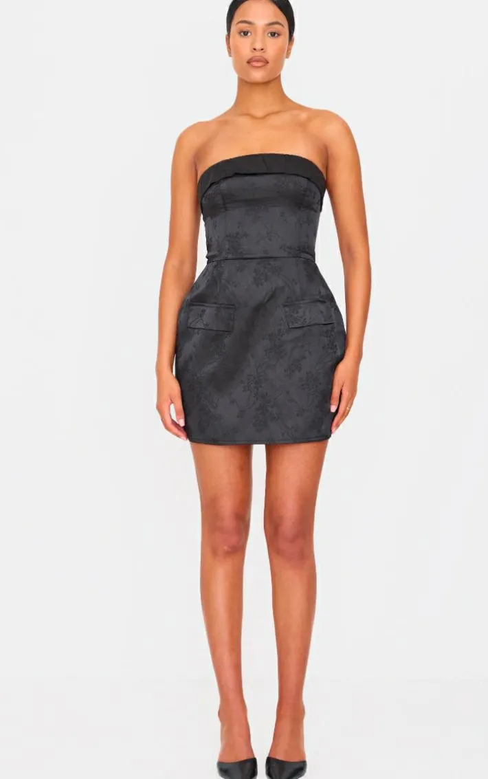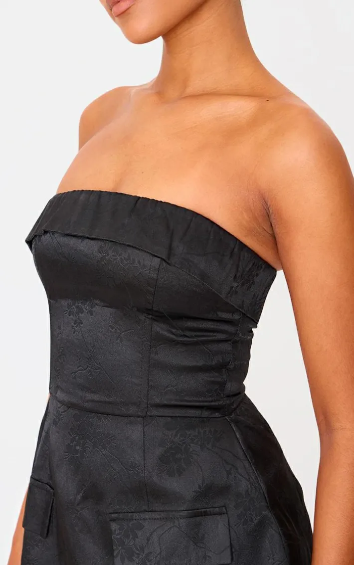When the weekend calls so does this tall black satin floral jacquard bandeau mini dress. Brought to you in a black hue satin material with a floral jacquard design and bandeau neckline, this mini dress is a must have for your new season collection. Style with slip on heels and simple accessories for a look like no other.