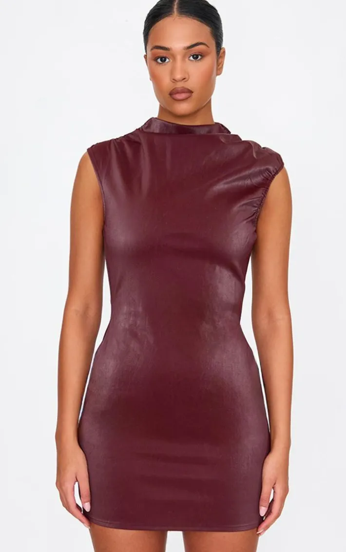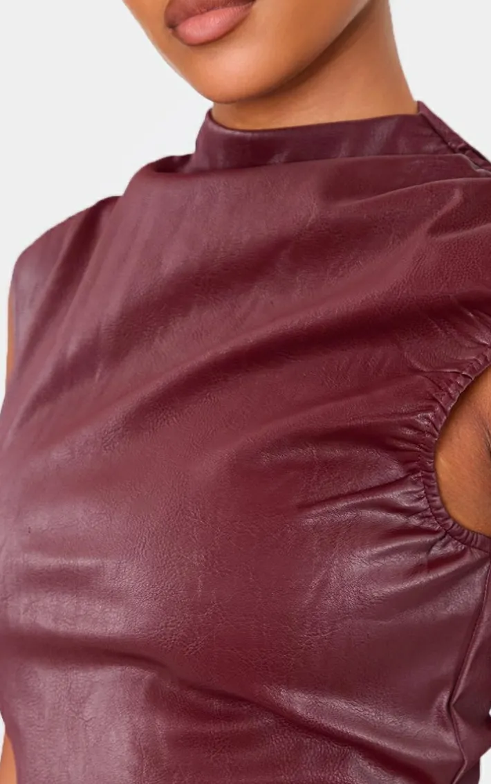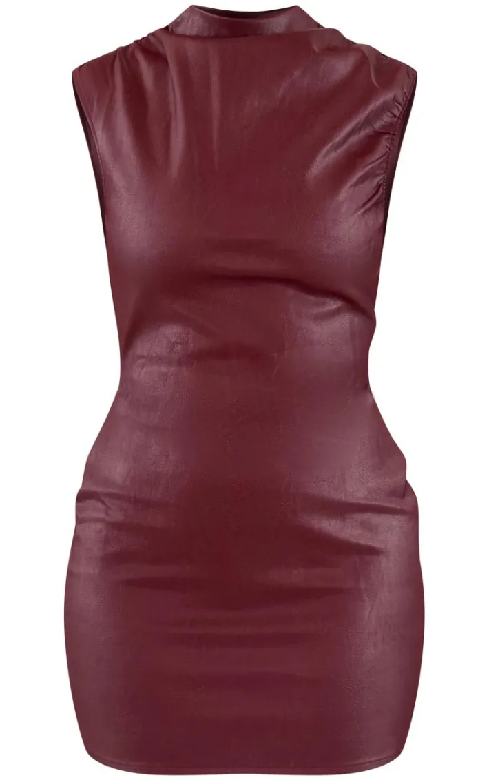 Stay on trend this season with this tall burgundy faux leather ruched detail mini dress. Brought to you in a burgundy hue faux leather material with a ruched detail, this mini dress is all the new you need. Style with slip on heels and simple accessories for a look like no other. You’re sure to be noticed in this.