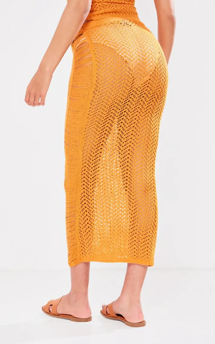 Get ready to have heads turning for all the right reasons in this statement tall burnt orange open knit distressed detail midi skirt. With a burnt orange open knit material, a distressed design and a midi length, you’ll be adding this tall skirt straight to your basket. Just add the matching top, heels and your fave accessories for a fierce finish.