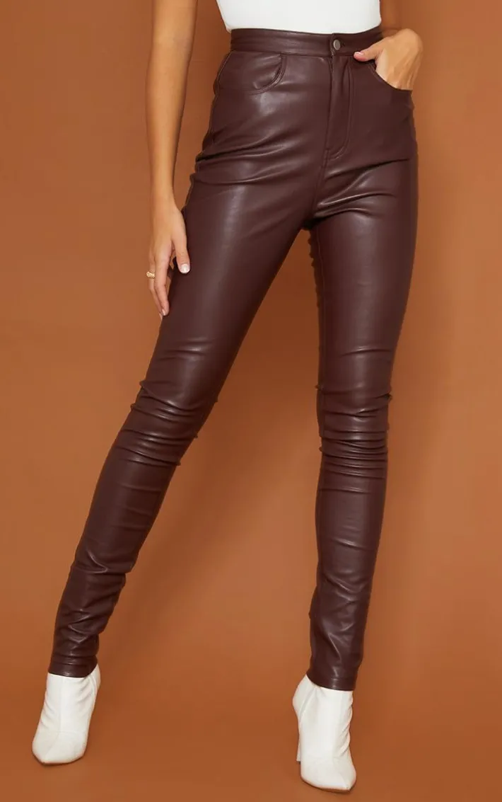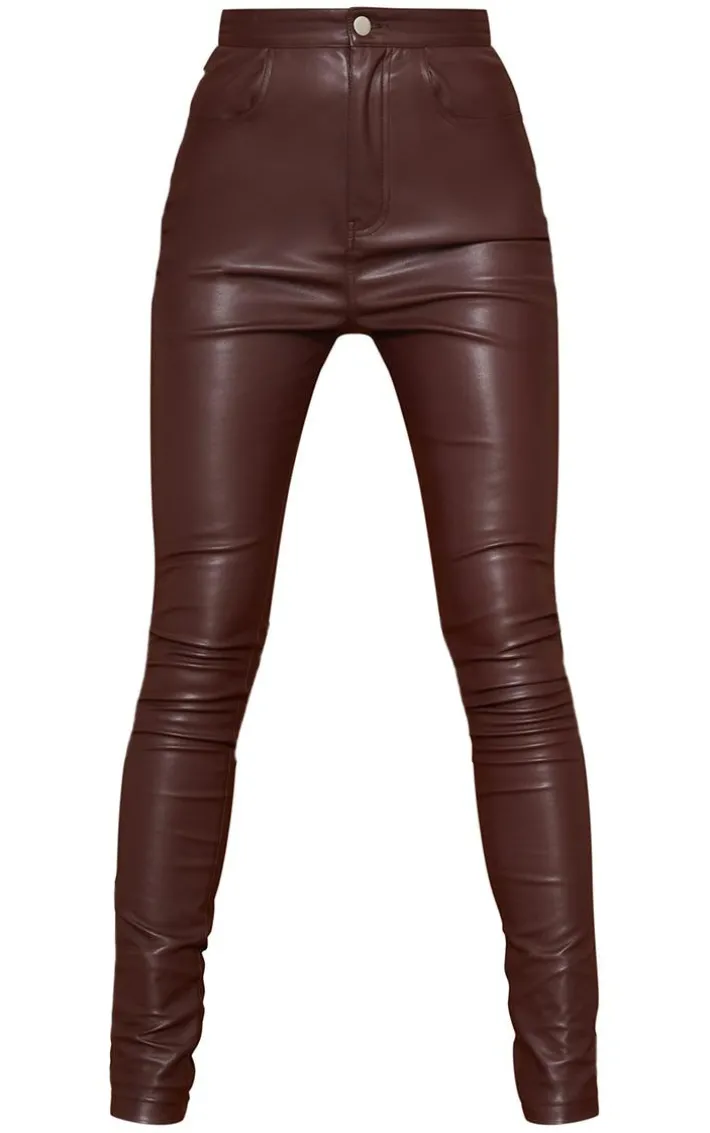 these bottoms are perfect for your A/W wardrobe. Featuring a chocolate faux leather material with a button-up design and a skinny fit, we are in love. Wear with a high neck top and a varsity jacket for a look that will get you noticed.