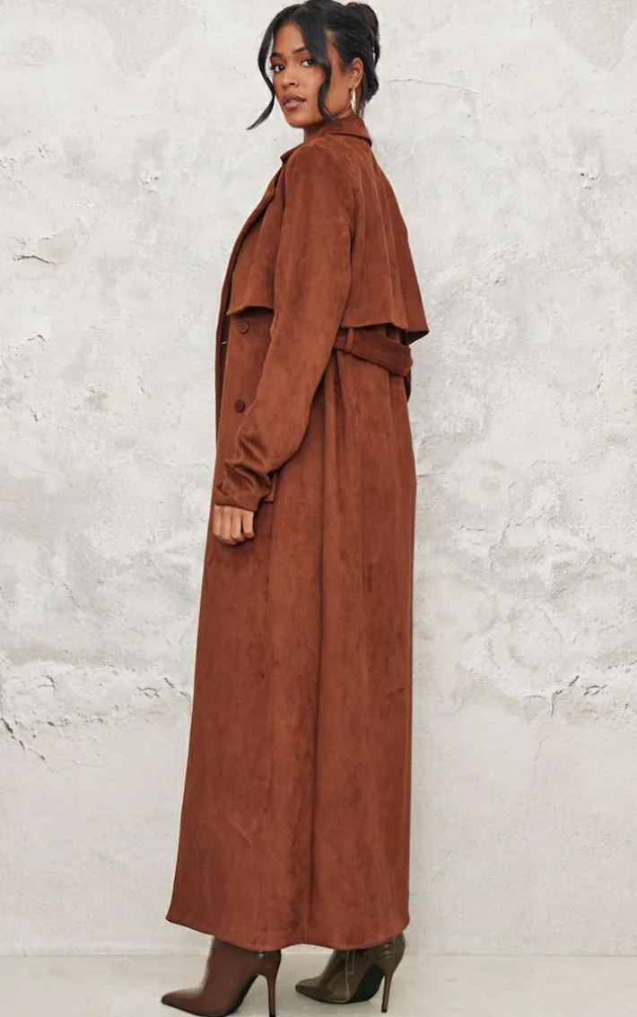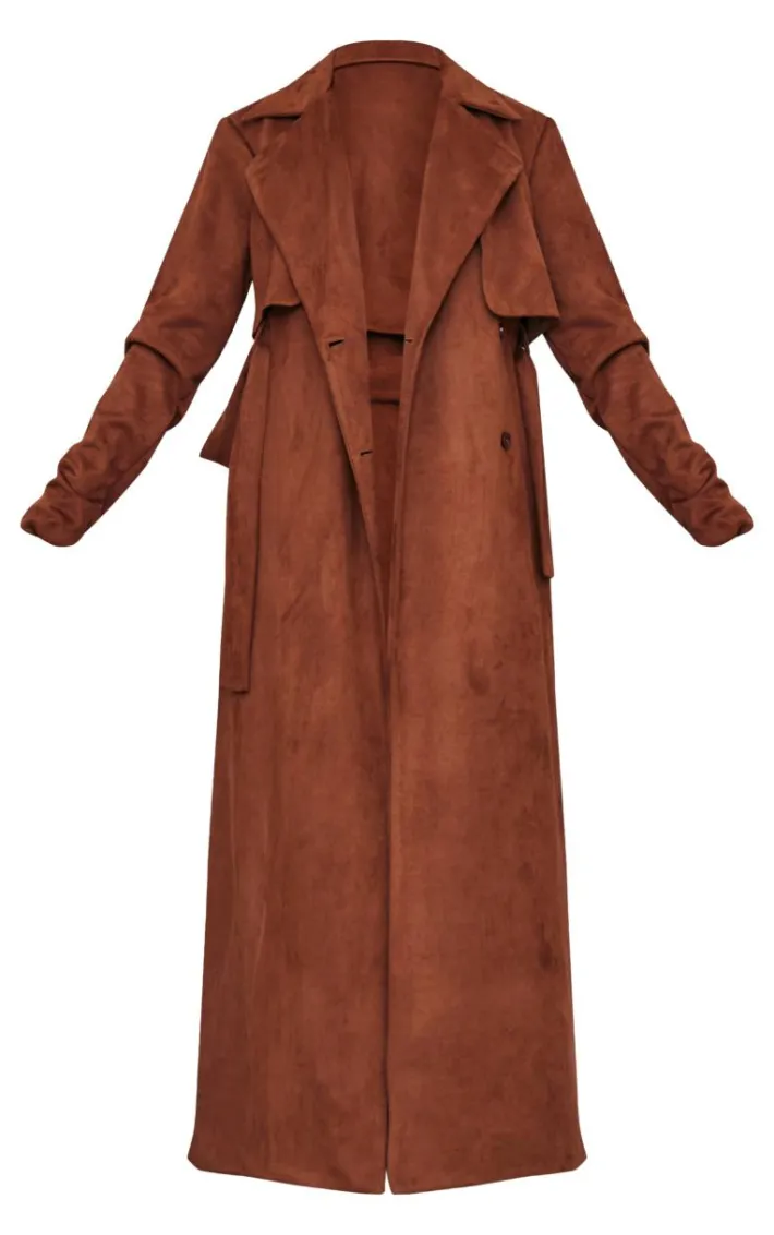 Introducing this tall chocolate faux suede belted maxi trench coat, your new style staple. Brought to you in a chocolate faux suede material with a belted detail and a maxi length that is sure to have you making a statement. Team this tall trench coat with some knee high heeled boots, shorts and a basic tee for a fool proof finish.