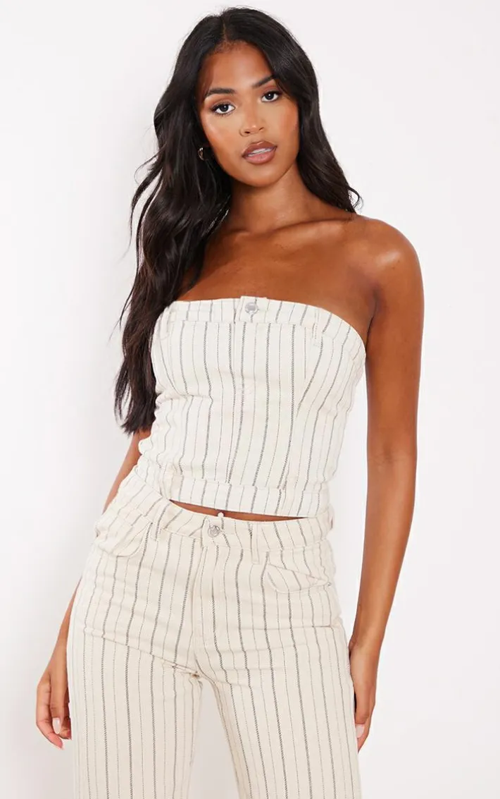 We have got your next weekend ‘fit covered with this tall cream denim pinstripe corset top. If you have a brunch date in the diary or a night planned , this corset top is the answer to all your what-to-wear dilemmas. Made from a cream denim material with a pinstripe design and a button detailing, how could you say no? Pair with the matching jeans, clear heels and minimal accessories for a simple but chic finish.