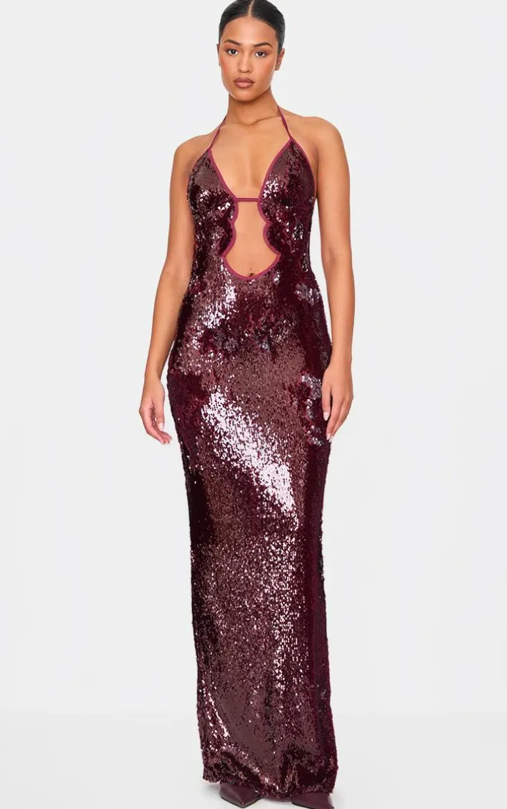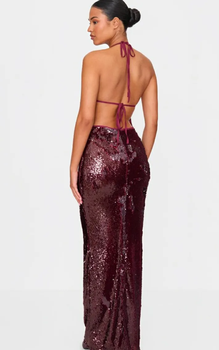 Make a statement this season in this tall dark red sequin plunge halter neck maxi dress. Brought to you in a dark red hue sequin material with a plunge design and halter neckline, this maxi dress is a wardrobe staple you’re in need of. Style with slip on heels and simple accessories for an event-worthy fit we can’t take our eyes off.