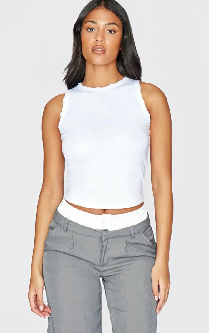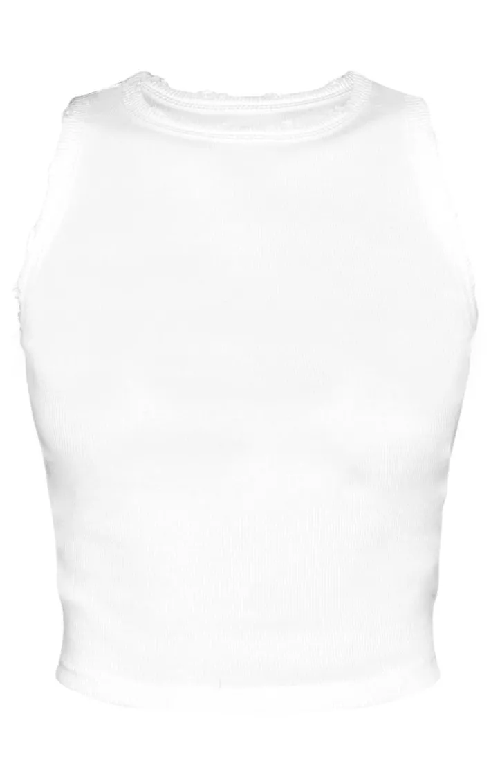 Level up your basics collection with this tall white distressed racer neck crop top. Brought to you in a white distressed material with a racer neck design, you are sure to reach for this crop top again and again. Team with wide-leg pants and a pair of sneakers to complete the look.