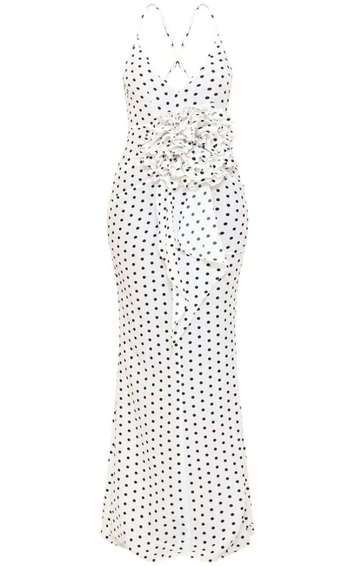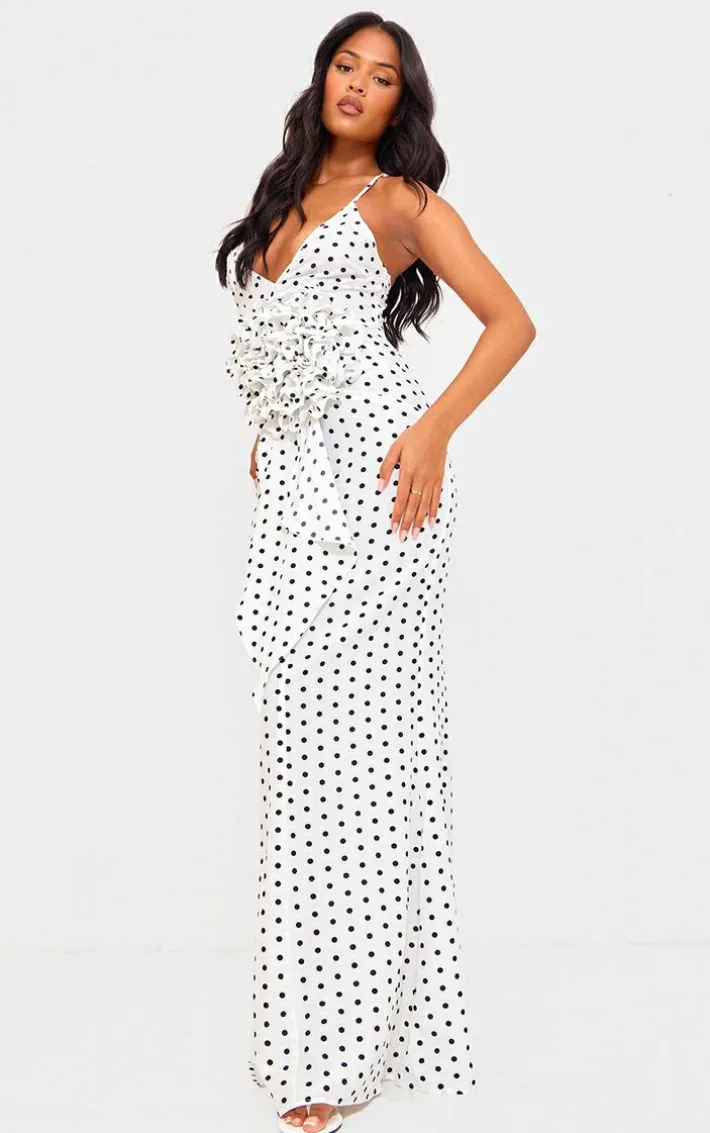Get ready for all your weekend plans with this tall white polka dot satin rose detail maxi dress, you’re sure to have heads turning. This tall dress features a white satin material with a polka dot print and a rose detail. Style this satin dress with heels and your go to accessories for a luxe, occasion ready fit.