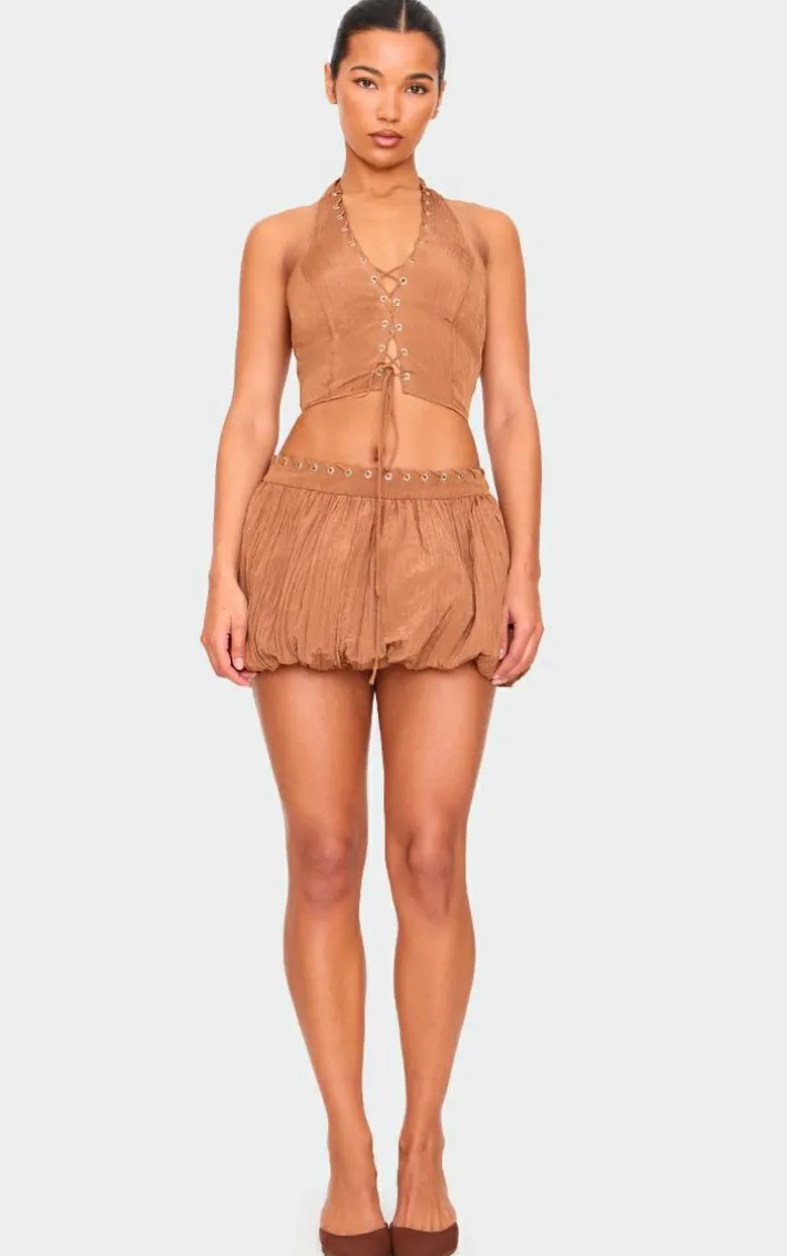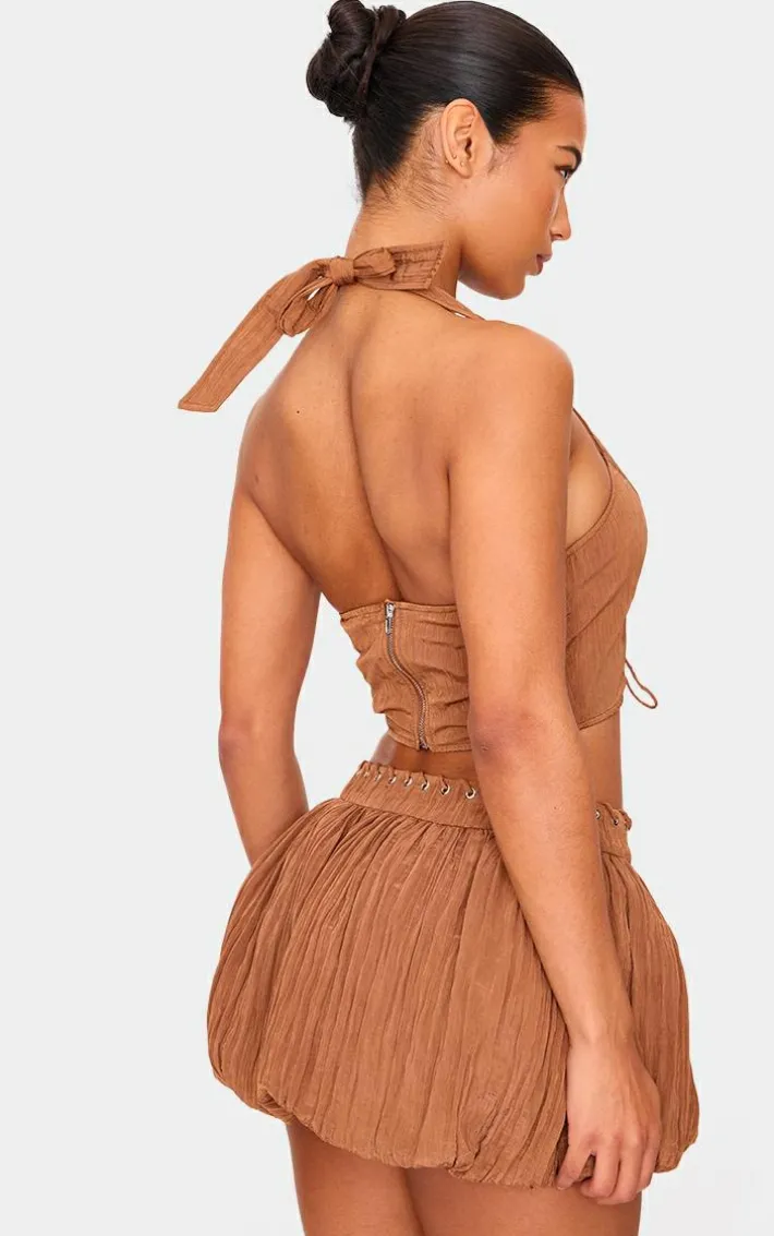 Instantly elevate your weekend look with this tan crinkle eyelet detail halterneck top. Brought to you in a tan hue crinkle material with a halterneck design and eyelet detailing, how can you resist? Pair this tan top with the matching mini skirt and court heels for a look that is sure to have all eyes on you.