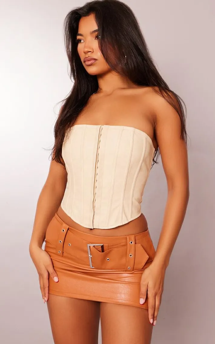 We can’t get enough of faux leather this season so make sure your weekend look stays on trend with this tan faux leather belted low rise micro mini skirt. Brought to you in a tan hue faux leather material with a low rise design, belted detailing and a micro mini fit, how can you resist? Style this micro mini skirt with a corset top, knee length heeled boots and gold accessories for a seriously chic look that won’t go unnoticed.