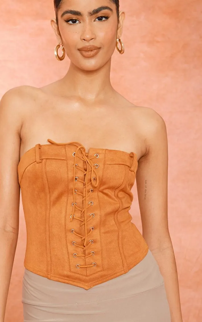 When the weekend calls for a little drama this tan faux suede eyelet lace up bandeau corset is sure to be at the top of your hit list. Brought to you in a tan faux suede material with a lace up design and a figure-worshipping fit, how could you resist? Style this corset top with a midaxi skirt, clear slip-on heels and your biggest hoop earrings for a look no one will forget.