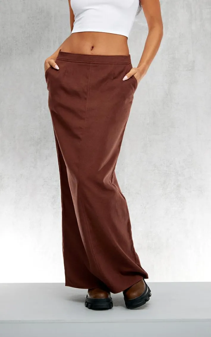 Take the stress out of weekend styling with this unreal tan soft twill blend straight maxi skirt. Brought to you in a tan soft twill material with a straight style and a maxi length, you really can’t go wrong with this maxi skirt. Style with clear strap heels and gold accessories for a look that will have eyes on you for all the right reasons.