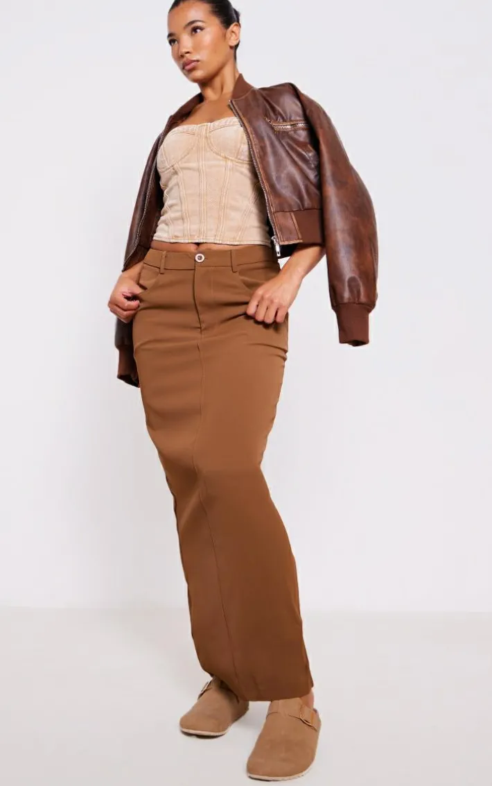 Level up your new season wardrobe essentials with this tan woven split back maxi skirt, you’ll be reaching for this must-have piece whatever your plans. This maxi skirt features a tan woven material with a split back design and a figure-flattering fit, what’s not to love? Style this maxi skirt with a corset top, mules and a faux leather jacket for a chic, weekend-worthy vibe.