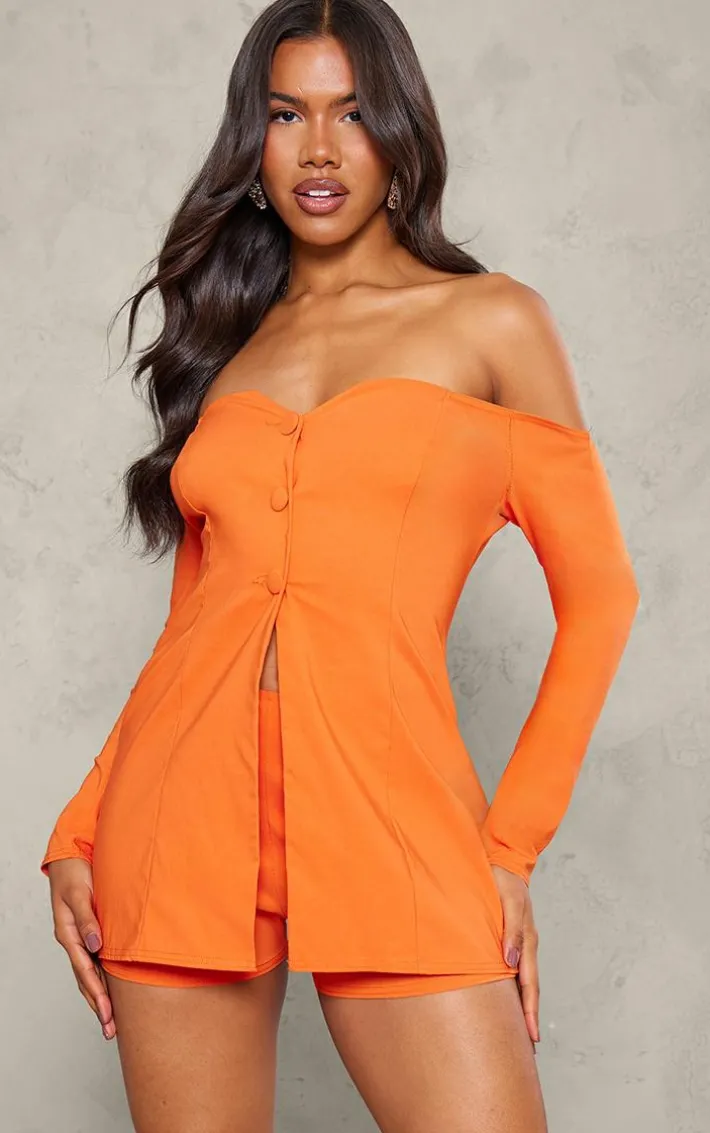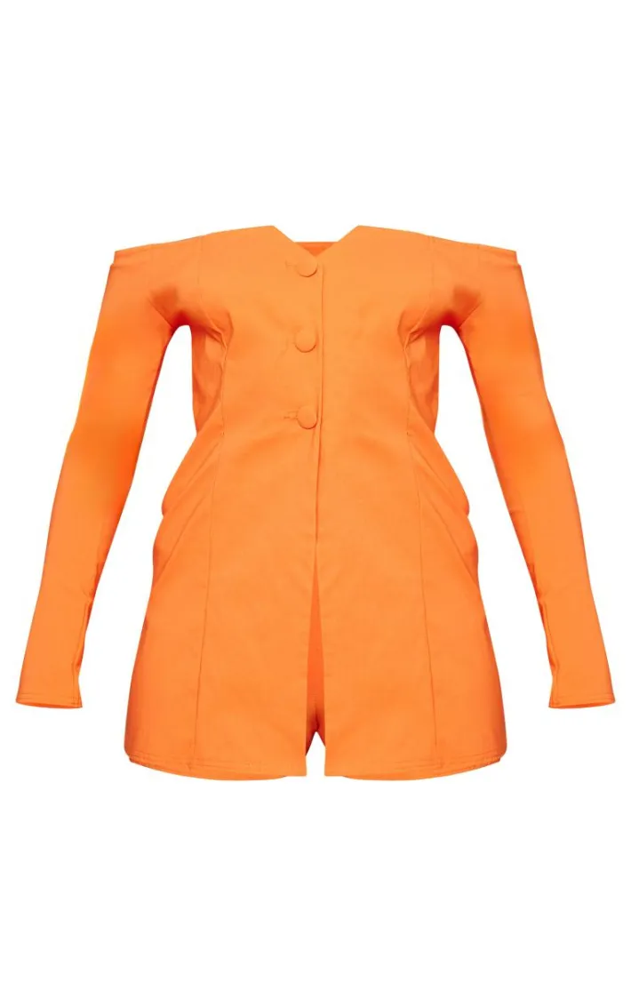 Stand out from the rest with this tangerine stretch woven bardot button down skort romper. Brought to you in a tangerine stretch woven material with a bardot button down design, what more could you want? This skort romper is all you need to make a statement. Team with a pair of heels and your fave accessories to turn heads for all the right reasons.
