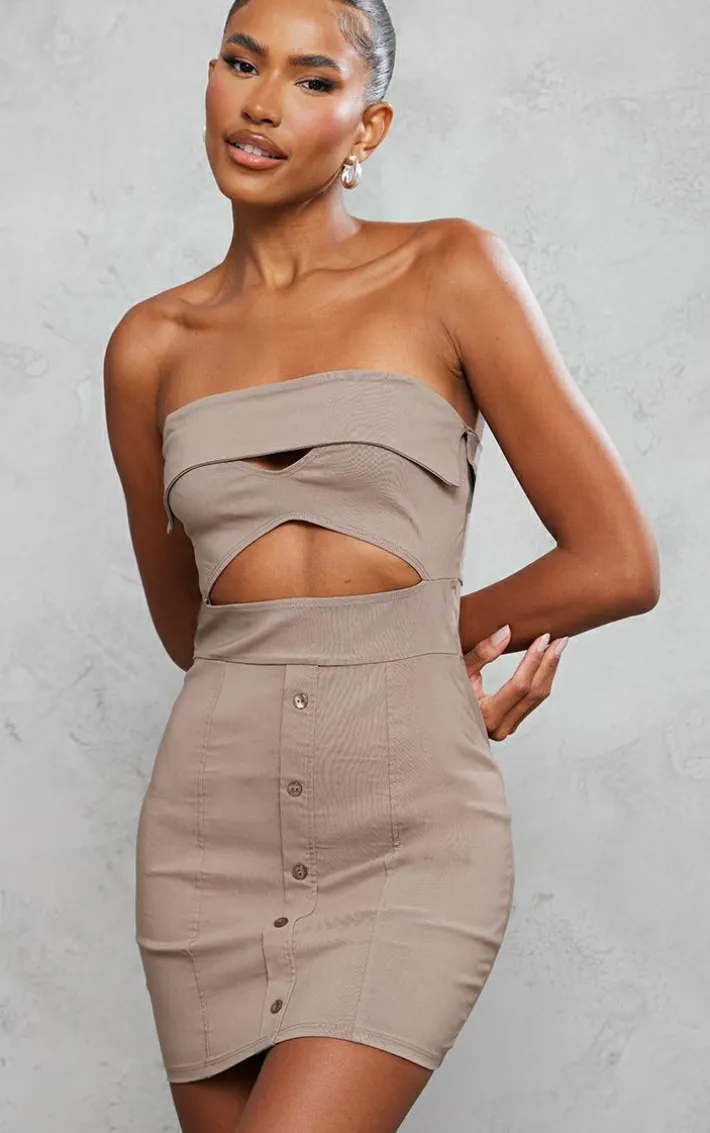 This season a taupe bandeau cut out button down bodycon dress is essential and we are loving this style. This dress is brought to you in a taupe hue that is sure to amp up your neutral collection doll. With a bandeau design and a cut out detail, what more could you want? Style with some gold hoops and a pair of white sneakers to finish off this effortlessly chic look.