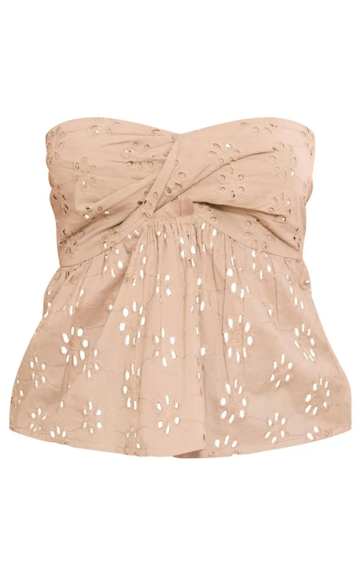Be on trend this season with this taupe broderie anglaise bandeau crop top. Brought to you in a taupe anglaise broderie material witha bandeau design and a cropped length, you will bring all the edge to your outfit of the day. This crop top is perfect for those on the go days. Team with a denim mini skirt, sandals and accessories to be the center of attention wherever you step foot this season..