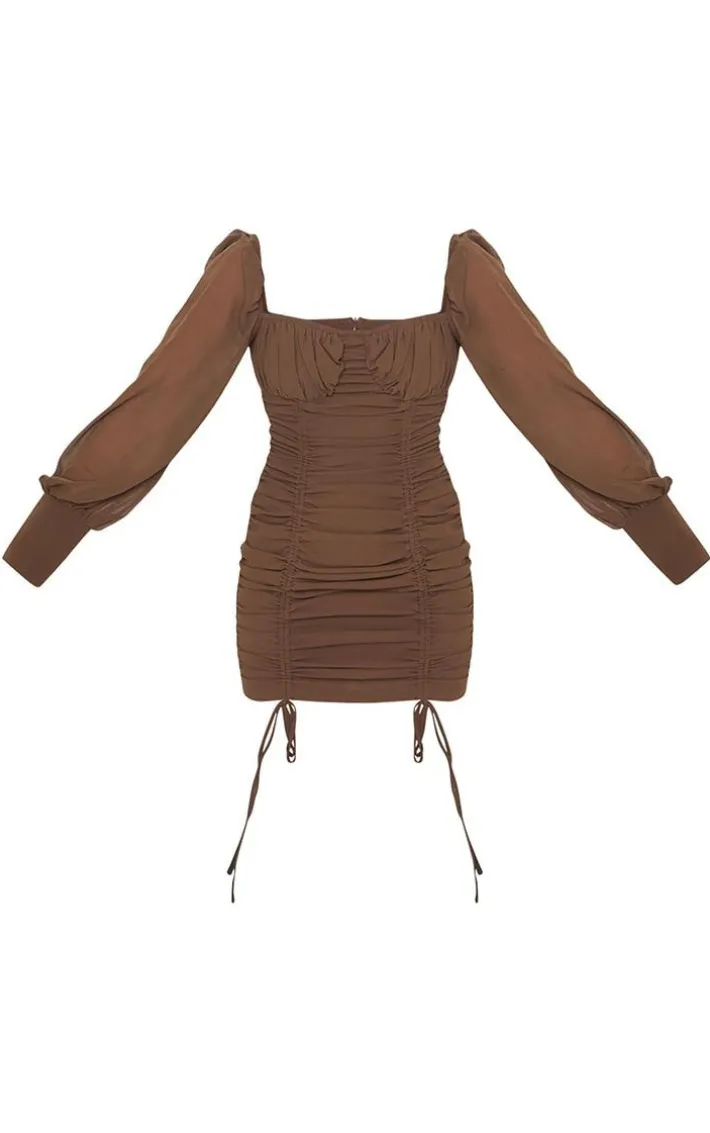 we are obsessed with this dress for heading outor your number one. Featuring taupe chiffon material with a ruched skirt detail, long sleeves, and a square neckline. For a weekend-worthy outfit, team it with strappy heels and a shoulder bag.