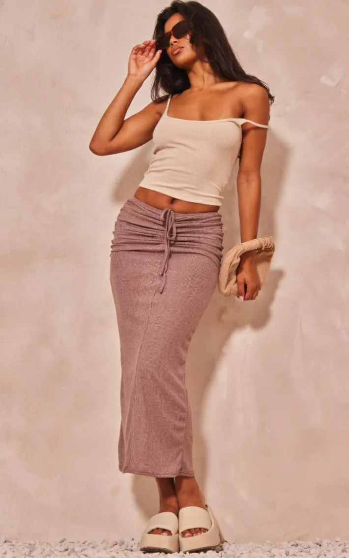 Every needs that staple skirt in their wardrobe and we’re obsessed with this taupe contrast rib ruched cut out maxi skirt. Its taupe contrast rib material is super comfy for those off-duty days and its ruched detailing elevates your look making it perfect for any weekend plans. This maxi skirt also features a cut-out design that will show off your unreal figure. Just add a basic top, chunky sandals and your fave accessories for a chic, blogger-worthy vibe.