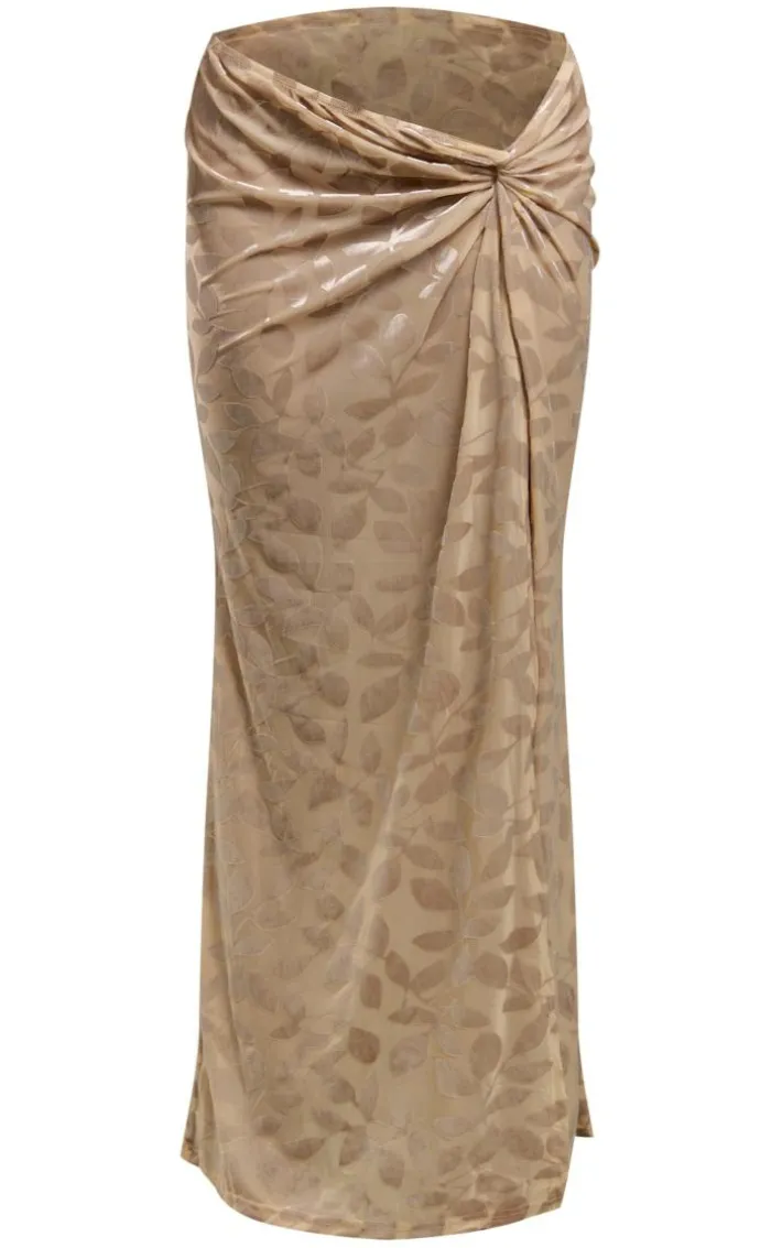Bring all the luxe devore feels to your occasion look with this taupe floral devore twist side midaxi skirt. Brought to you in a taupe hue floral devore material with a twist side design and a flattering midaxi length, how can you not fall in love? Style this midaxi skirt with the matching corset top, clear strap heels and gold accessories for an occasion look we just can’t get enough of.