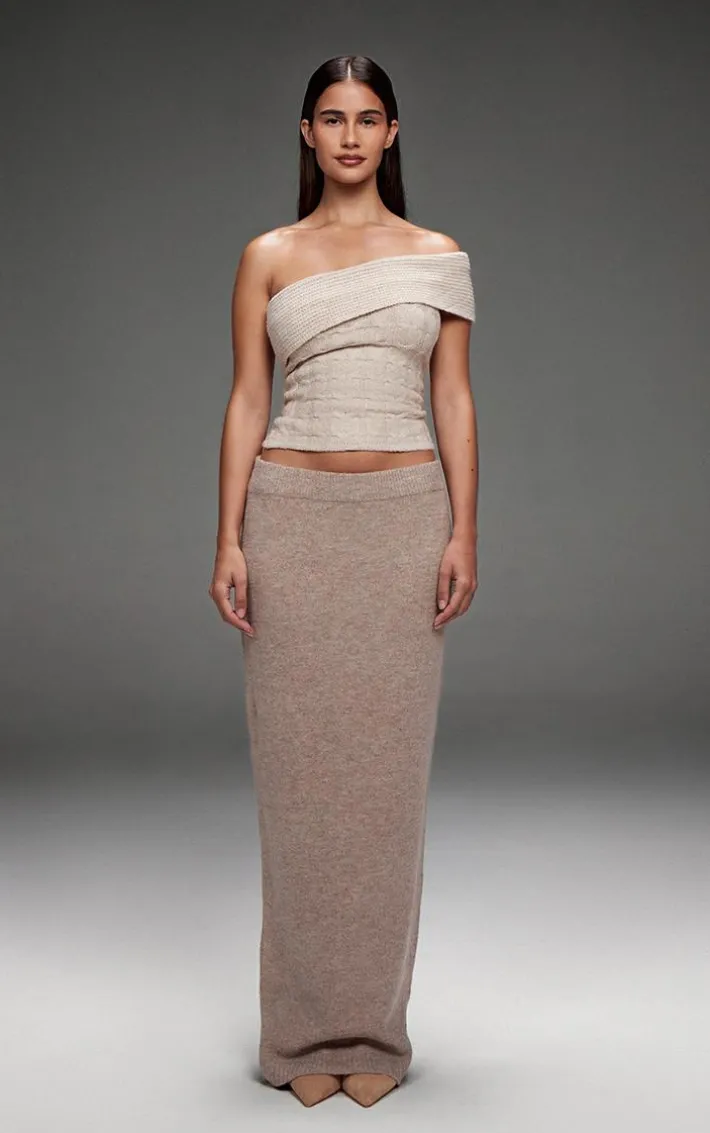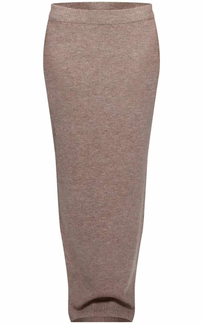 Elevate your look with this taupe melange soft knit maxi skirt is essential. This chic maxi skirt is brought to you in a taupe soft knit material with a melange design, we’re in love. Its maxi length gives you a flattering fit you won’t be able to resist. Why not team with an asymmetric knit top, slip on heels and simple accessories to complete the look everyone is talking about.