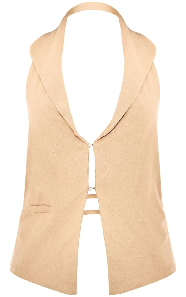 Amp up your weekend wardrobe with this taupe premium linen look strap back detail vest. Brought to you in a taupe premium linen look material with a strap back detail, this vest is at the top of our wish list. Pair with white bottoms, sandals and simple accessories to earn major style points this season.