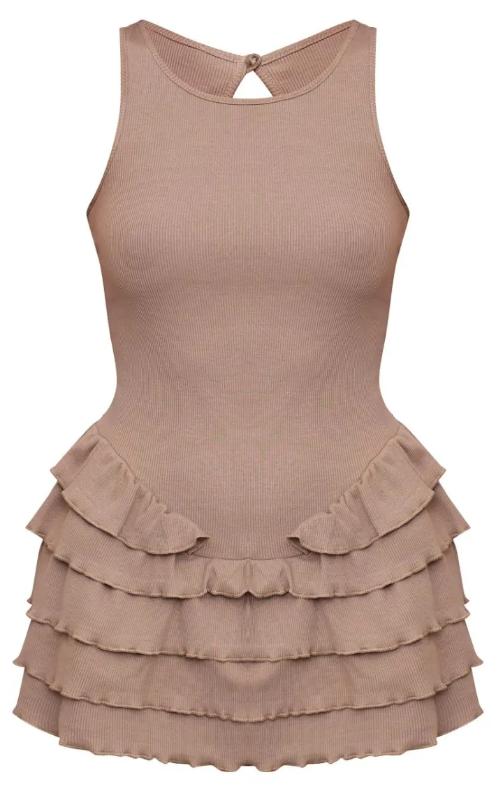 Take on the weekend the right way in this taupe rib racer neck rara romper. This taupe shade is unreal, and the rib material with an edgy racer neck design and rara detail, how could you say no? Style with some unreal leather look boots, an oversized brown jacket and shoulder bag to really nail the look.