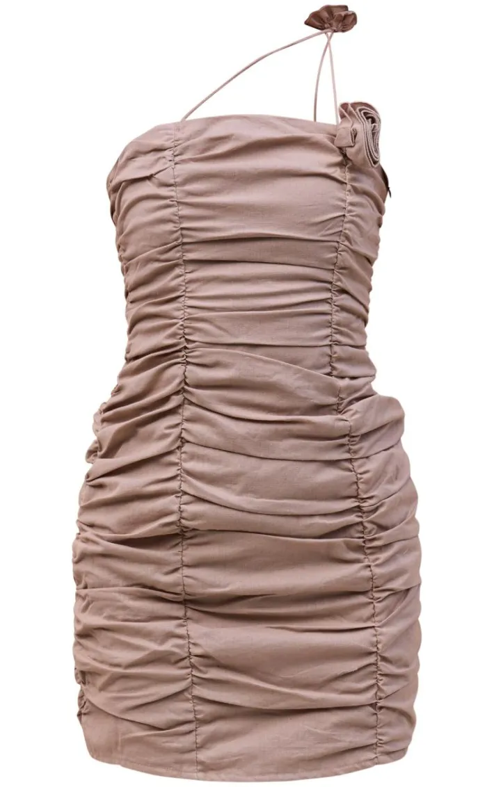 Amp up your neutral collection with this taupe ruched floral strap linen look bodycon dress. Brought to you in a taupe linen look material with a ruched floral strap design bringing all the feminine vibes to your wardrobe Its bodycon fit is sure to have you feeling confident. Team with a pair of chunky sandals and your fave accessories to elevate the look even further.