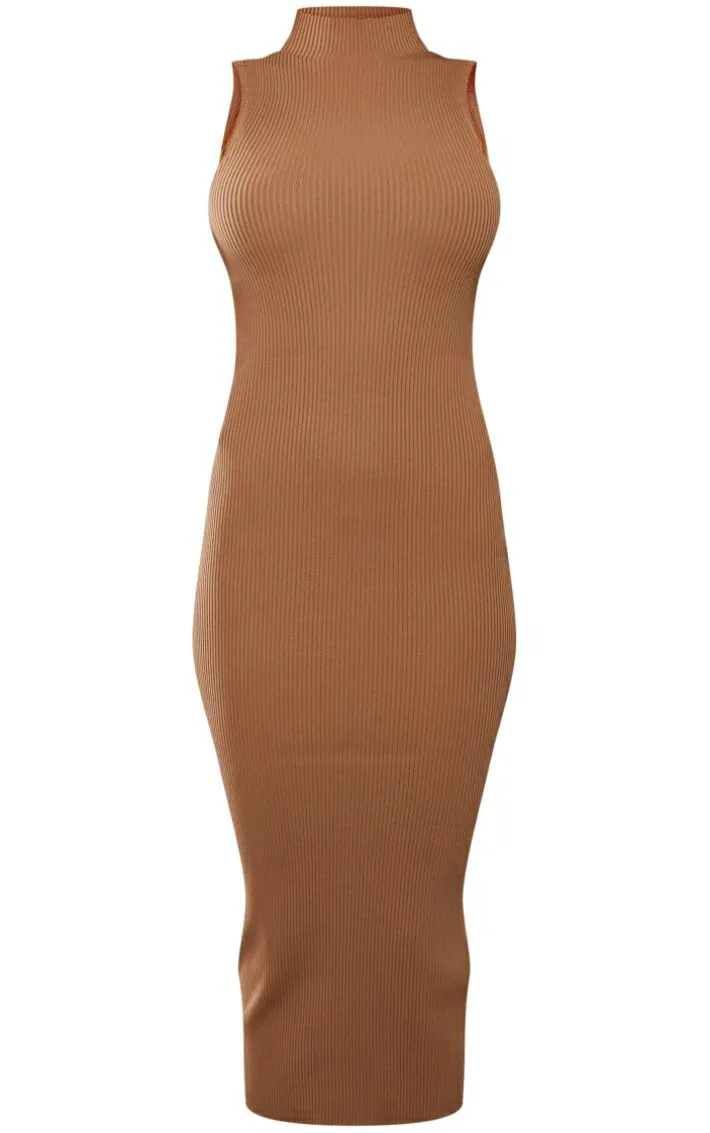 Make weekend styling simple with this midaxi dress. Featuring a taupe rib knit material with a sleeveless design, a midaxi length and a figure-hugging fit, we’re in love. Style with a cropped jacket and clear heels for a luxe finish.
