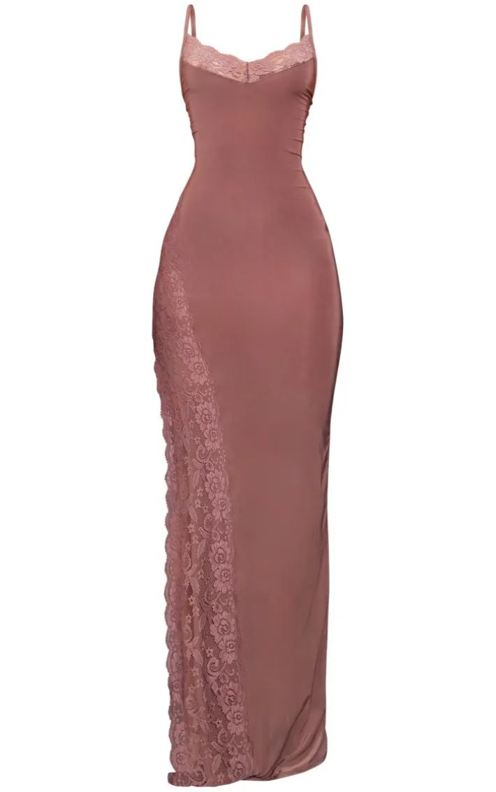 Nail all the major trends this season with this taupe slinky lace trim split detail maxi dress. Its taupe slinky material is a must-have for the summer whilst its lace trim detail and split hem adds all the glam vibes to your look. Whether you need a dreamy dress for your upcoming vacay or date night, this maxi dress is calling your name. Style with heeled mules, gold accessories and a mini bag for a flawless finish.