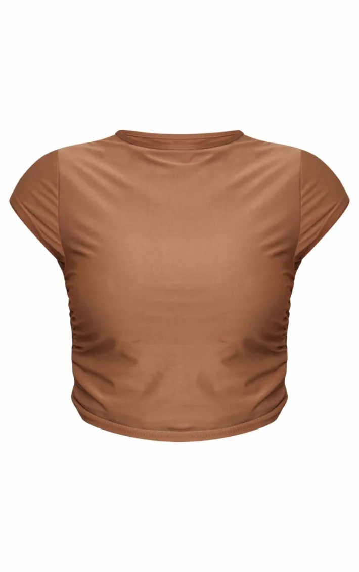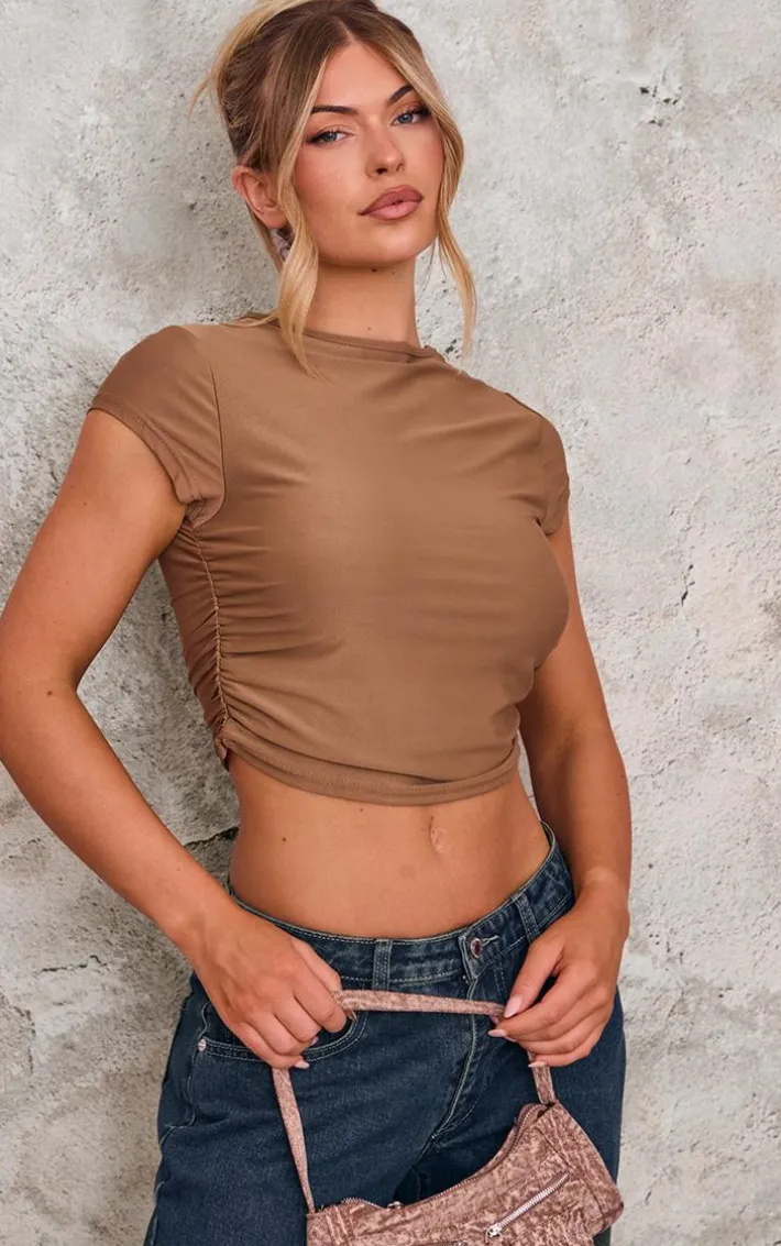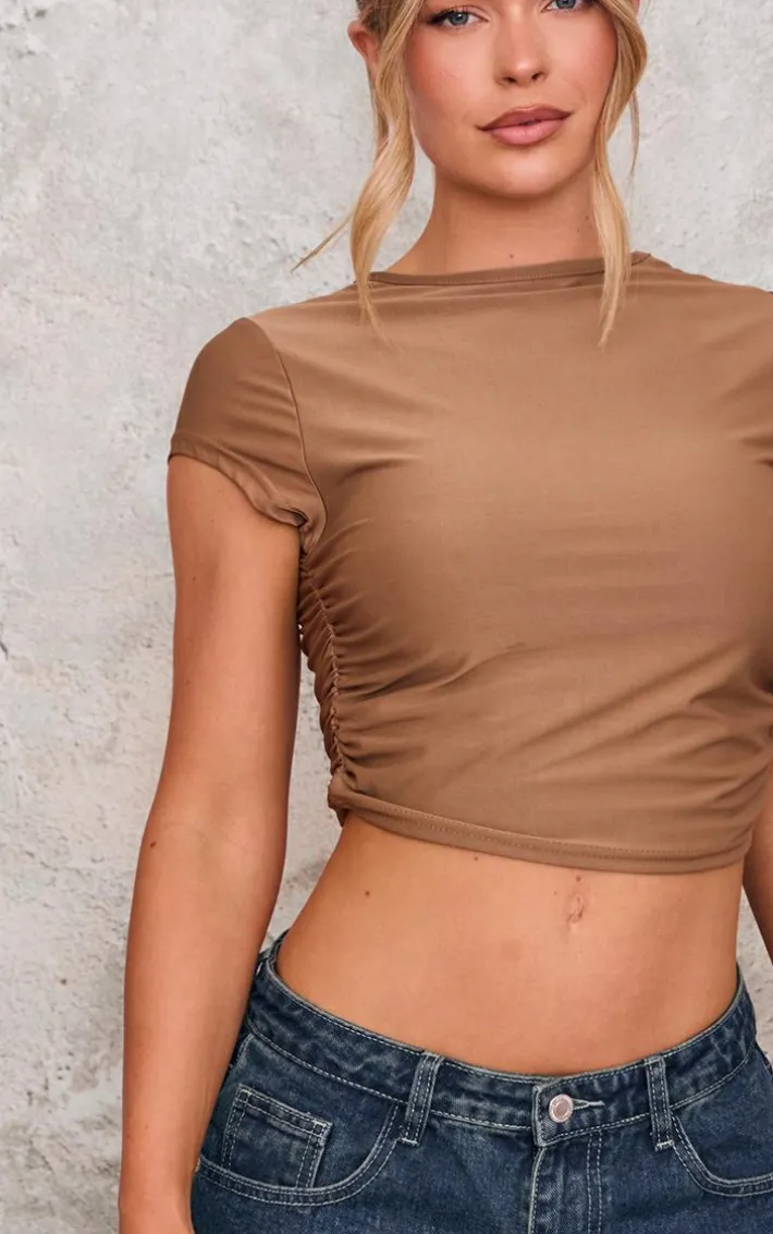 Hit refresh on your outfit of the day with this taupe slinky ruched detail crop top. Brought to you in a taupe slinky material with a ruched detail, this crop top is everything you need and more. Style with blue jeans, slip on heels and gold accessories for a chic finish we can’t stop looking at.