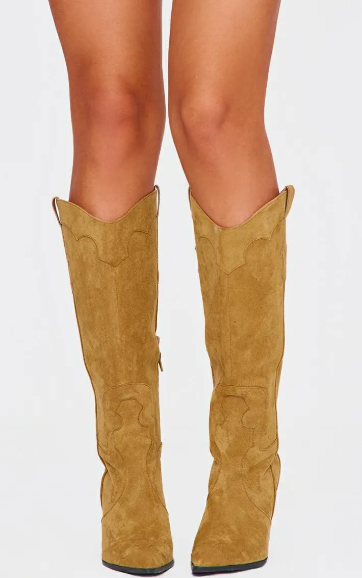 Take any look to new heights with these taupe wide fit faux suede point toe knee high heeled western boots. Brought to you in a taupe faux suede material with a point toe design and a high heeled detail, what’s not to love? These western boots pair perfectly with your go-to outfit of the day to feel stylish this season.