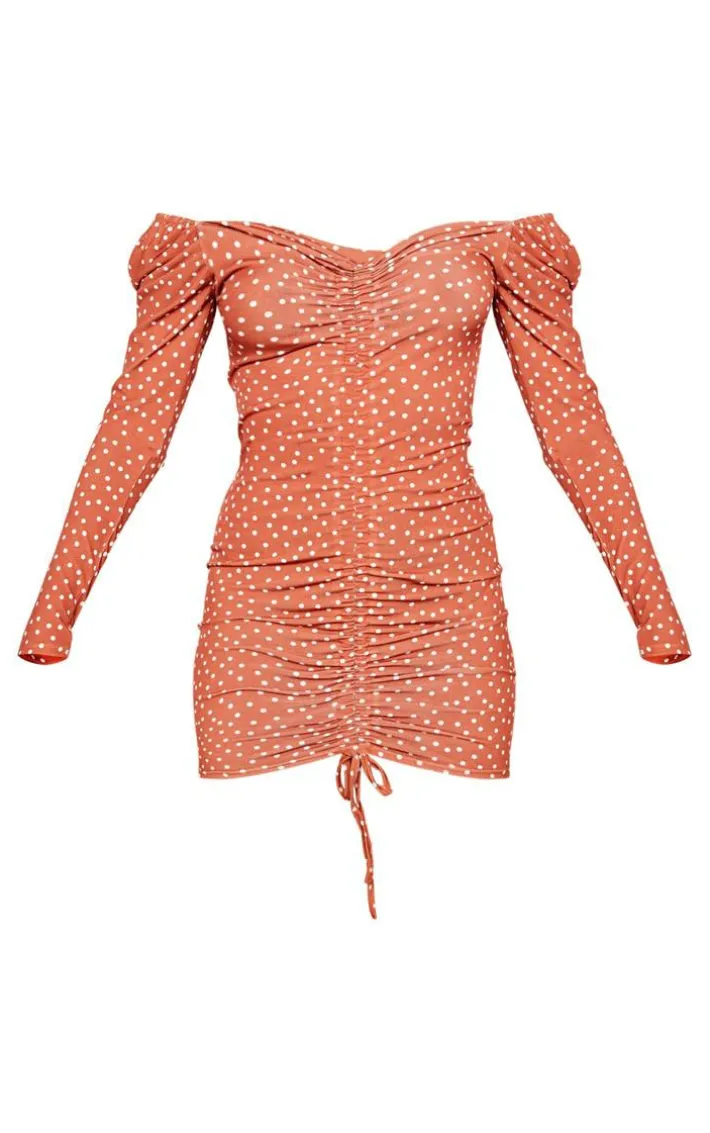 Look all kinds of glam in this dress. Featuring a terracotta polka dot print material with ruched front detailing and long sleeves. Style with slip-on heels and a mini bag for a chic weekend-worthy combo.