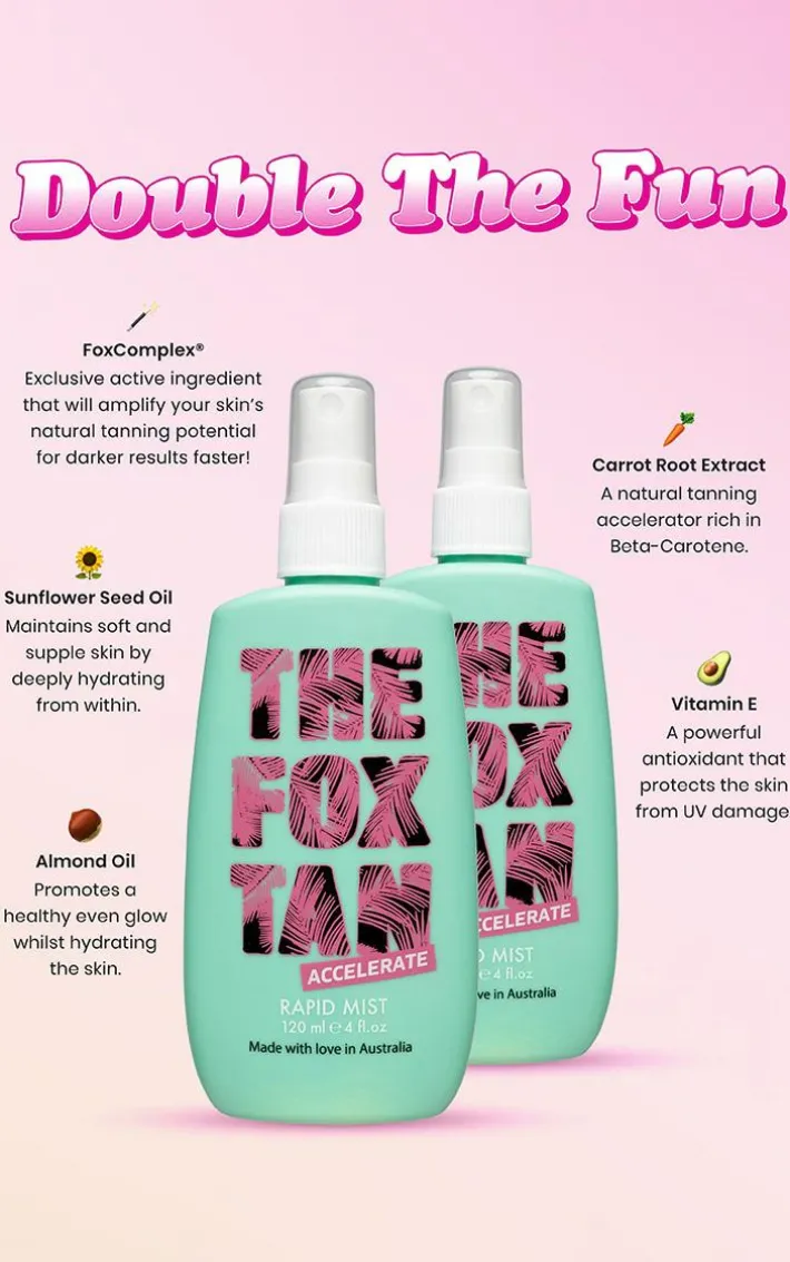Rapid Tanning Mist has been formulated with our exclusive ingredient FoxComplex® that dramatically increases melanin levels in your skin – this is vital for the tanning process. The Fox Tan Rapid Tanning Mist has been scientifically formulated to rapidly speed up your natural tanning process while in the sun or sunbed.